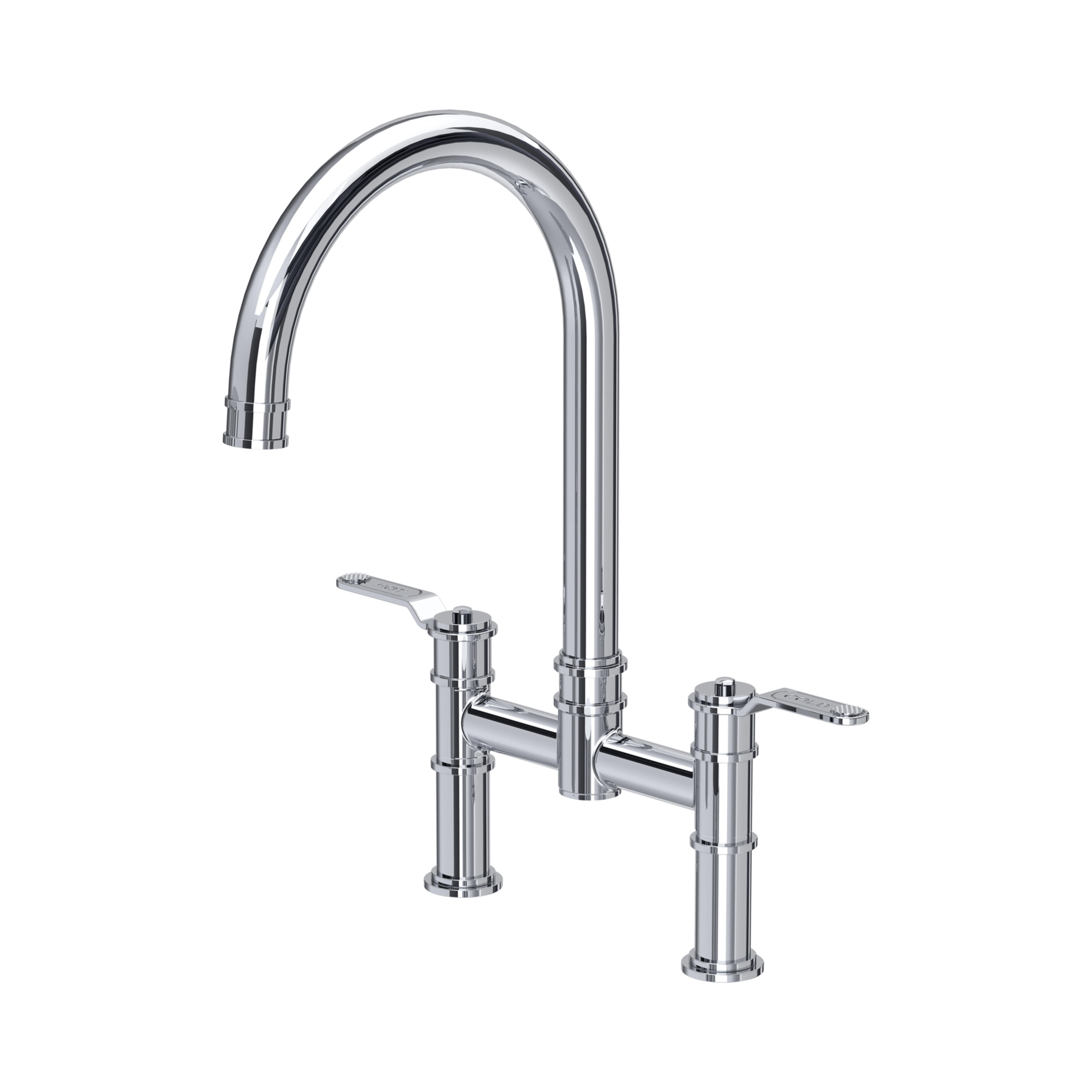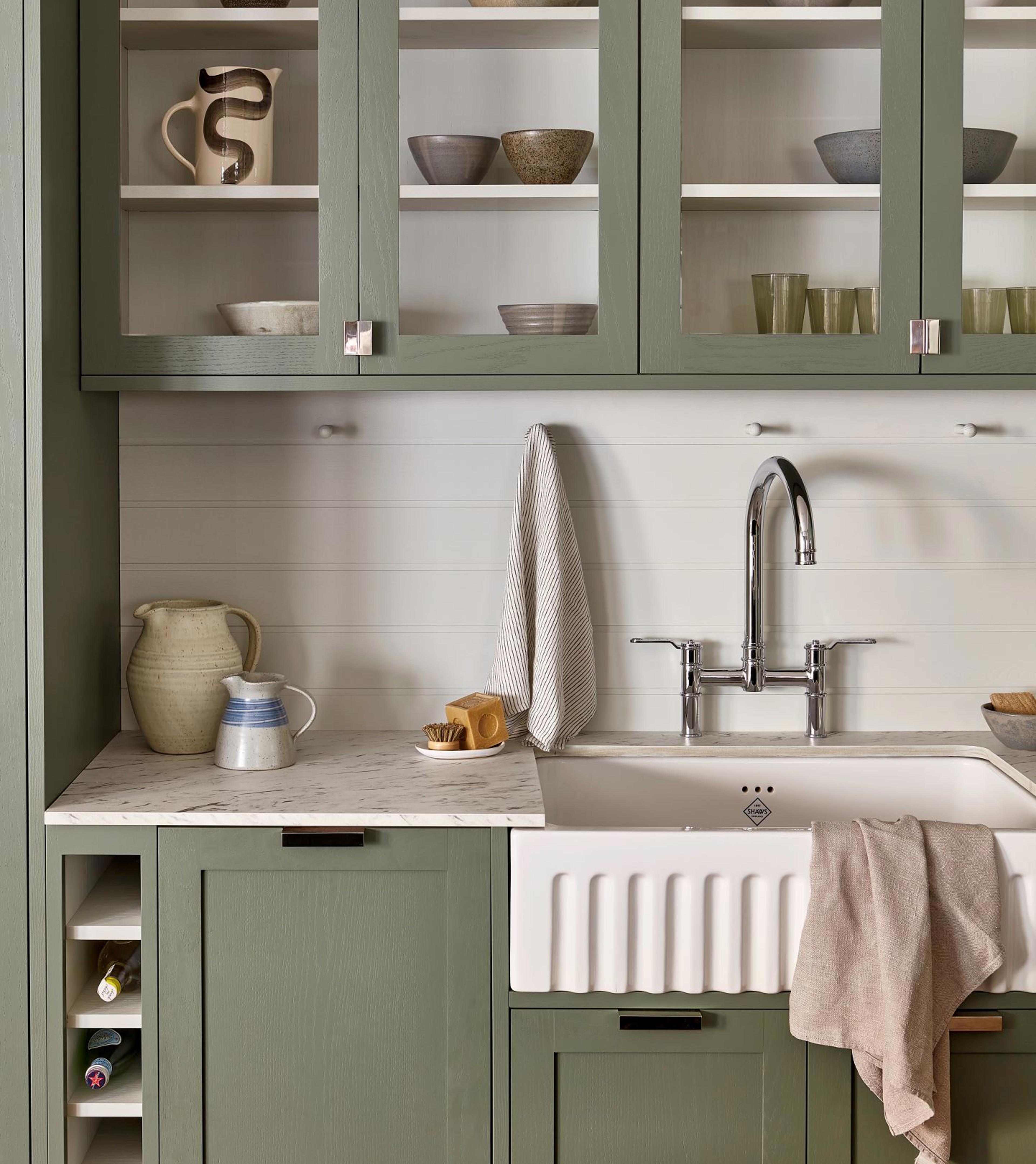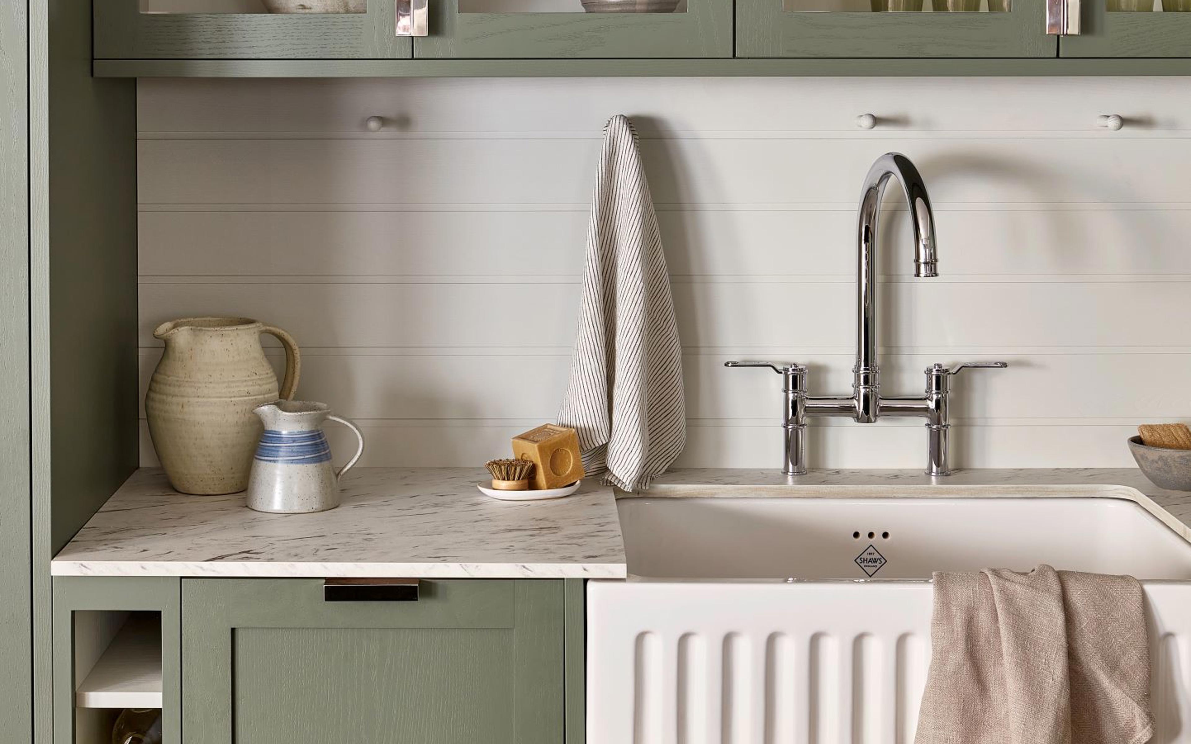 A Shaws of Darwen Bowland 800 sink makes a statement with its fluted front detailing. It's paired with the Armstrong Bridge Mixer in a modern polished chrome finish. Industrial in its look and feel, the Armstrong is a fun addition to this Shaker kitchen. A substantial oak larder offers plenty of storage.
