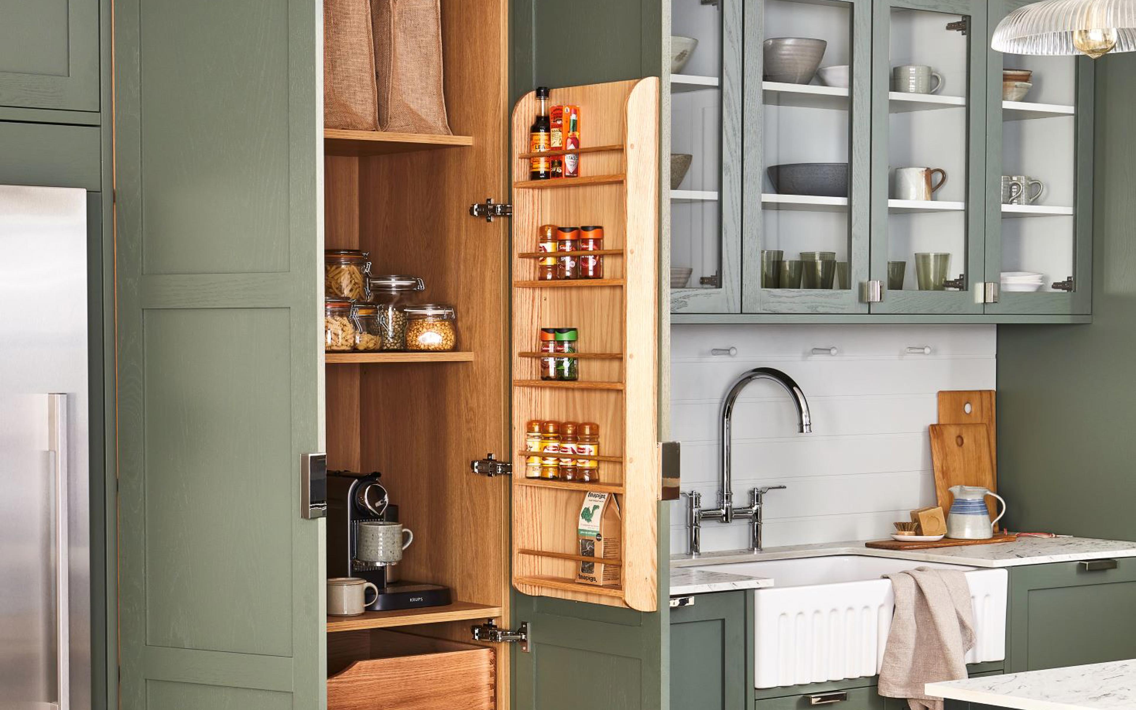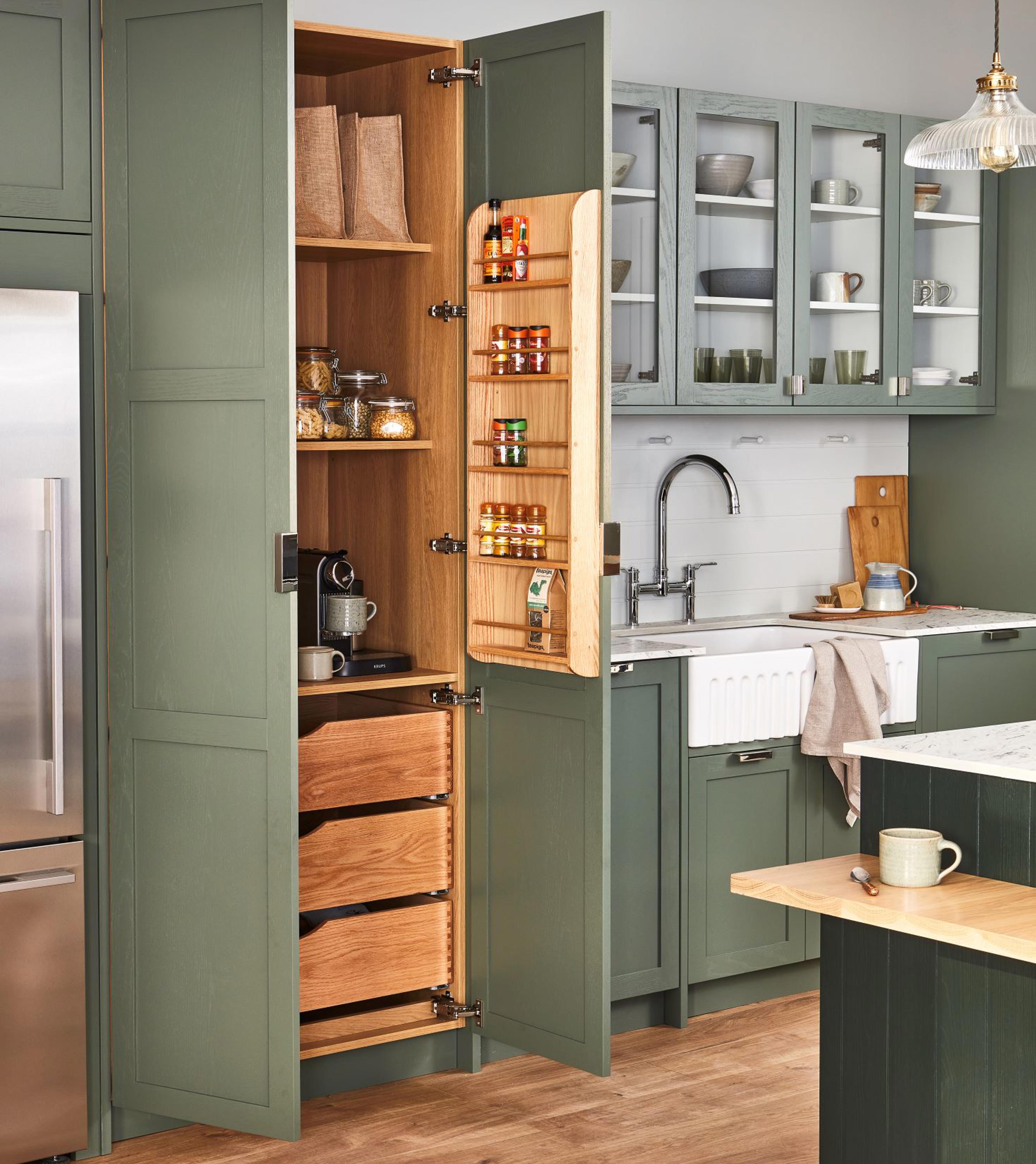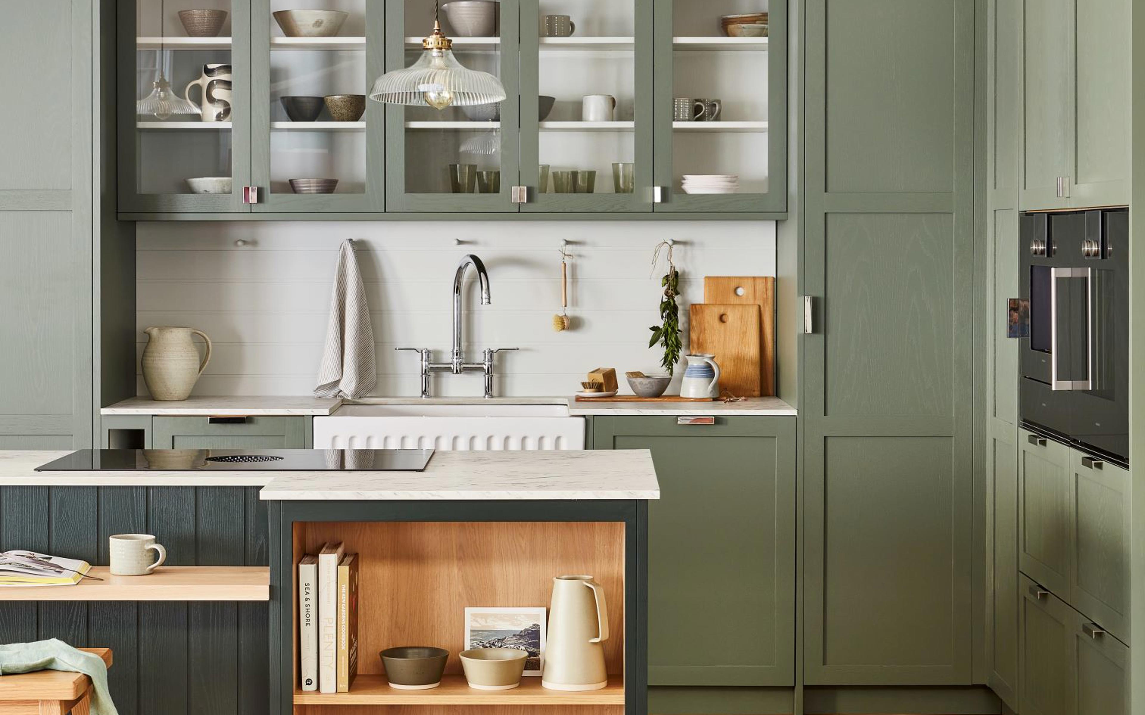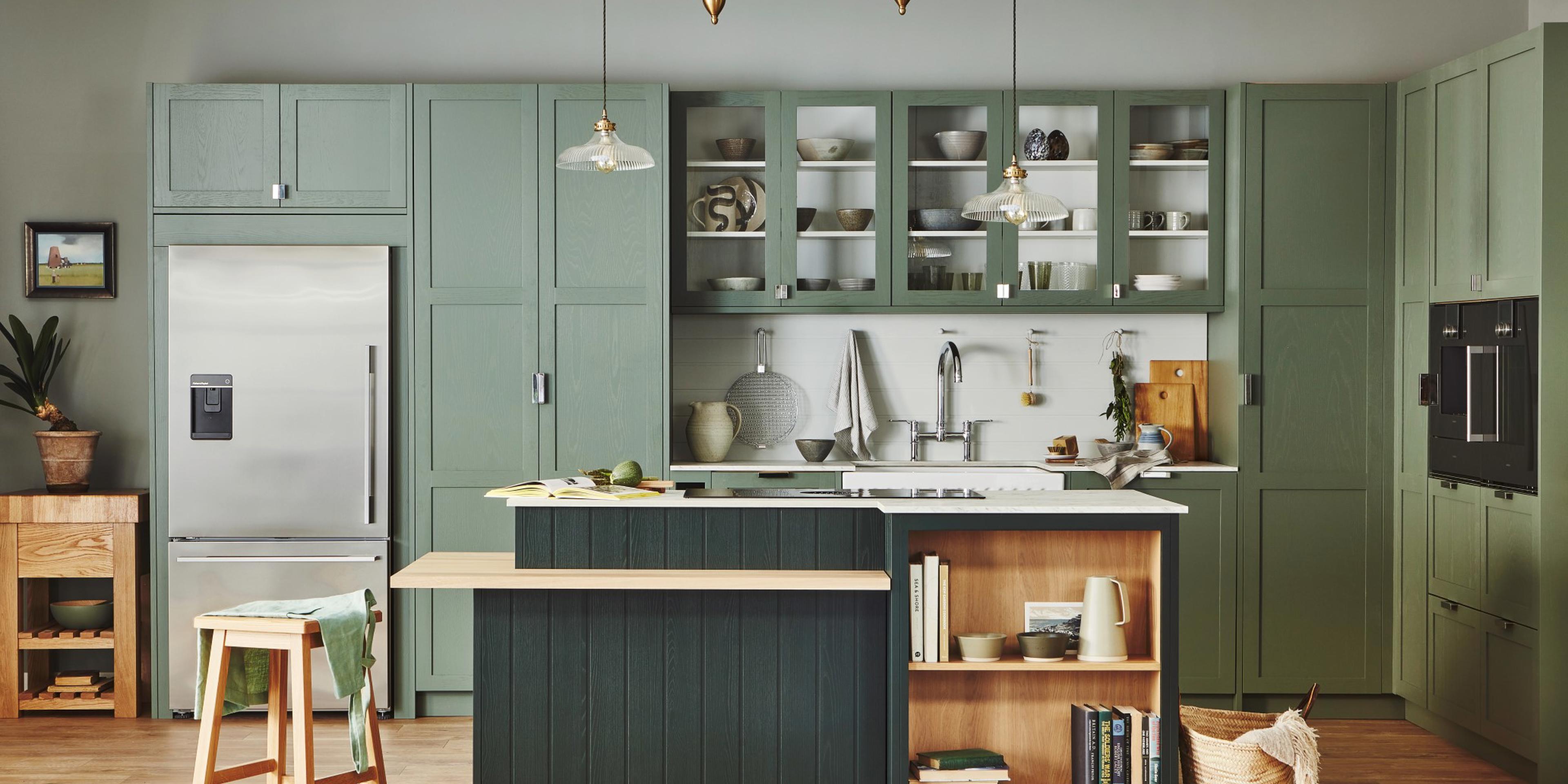The St Giles kitchen from Norfolk-based kitchen designers Naked Kitchens is a beautiful example of a contemporary Shaker kitchen. Finished in a trio of green shades and an oak breakfast bar, this kitchen is masterclass in blending traditional style with modern features.