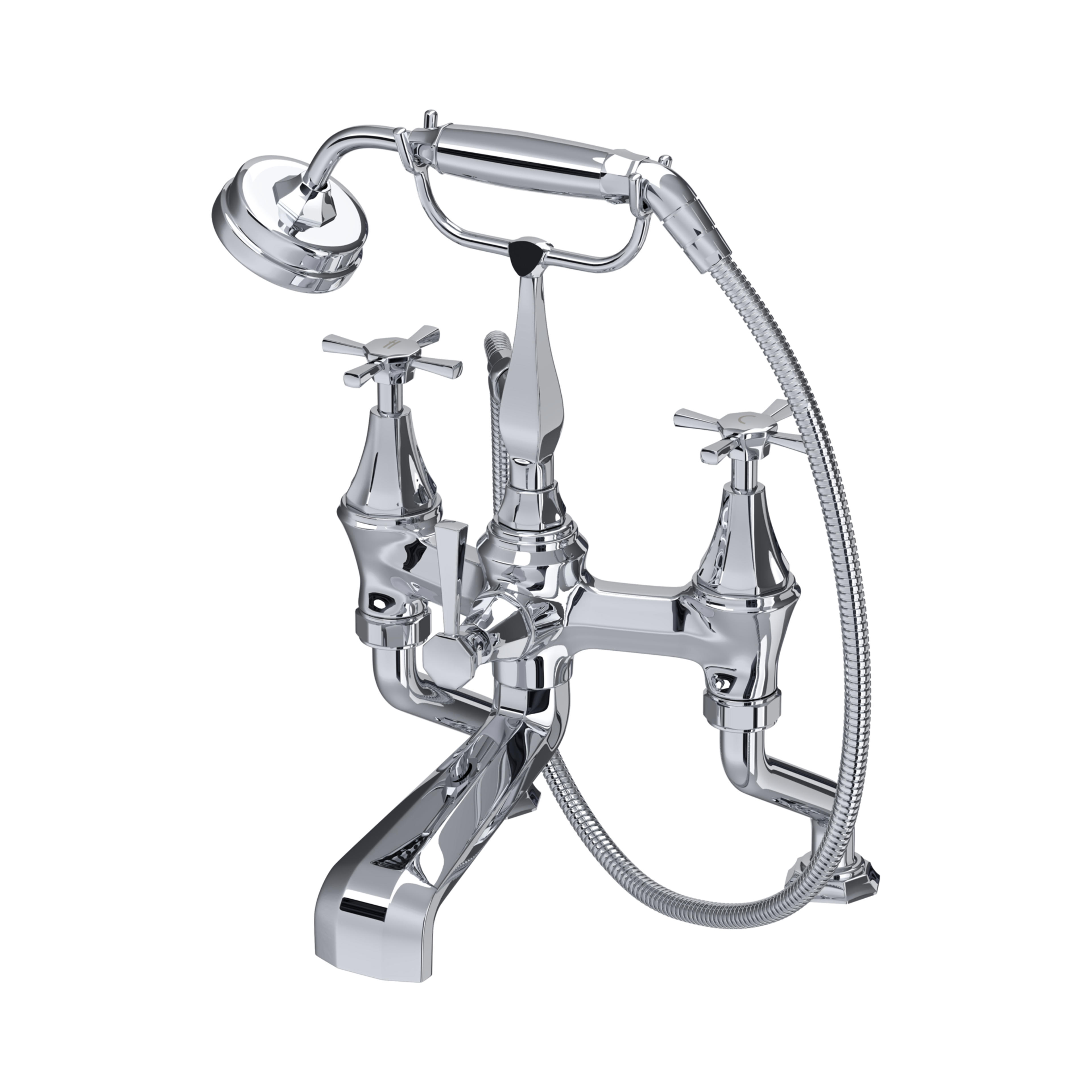 The Perrin & Rowe Deco collection draws inspiration from the Art Deco era of interior design; it's a unique collection that will create a hotel style bathroom in your own home. This beautifully detailed floorstanding bath-shower mixer is a show stopping piece that will complement a freestanding bath. It features crosstop handles with 'H' and 'C' lettering which have been etched into the plating for a premium finish, as well as a cradled handshower with a metal handle.