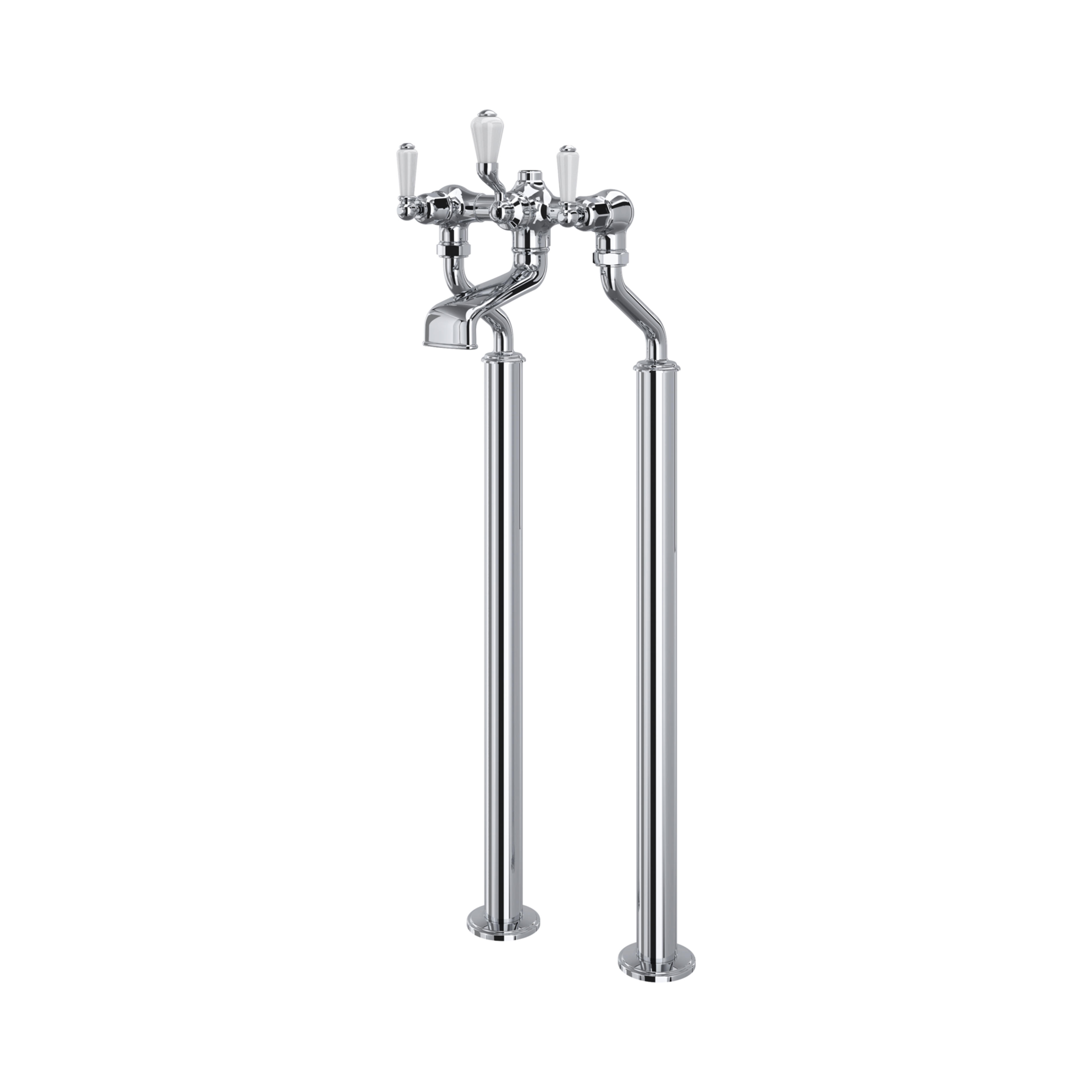 Create a statement in your bathroom with this freestanding bath-shower mixer, an iconic Perrin & Rowe design. This simplified design features porcelain inserts on the lever handles and no handshower attachment; a traditional design that is elegant and impactful.