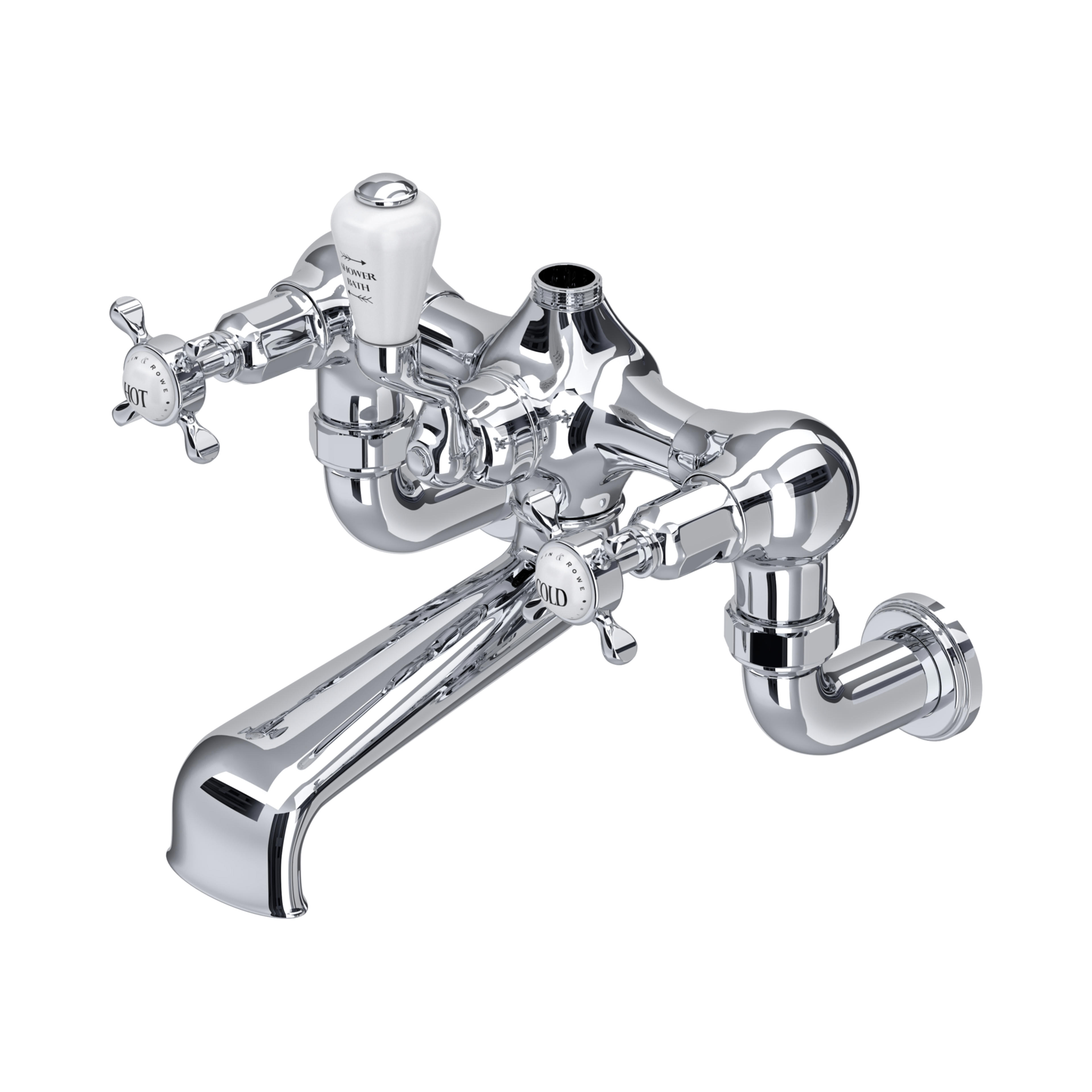 This Traditional bath-shower mixer mounts to the wall and features 'Hot' and 'Cold' ceramic indices on the crosstop handles to complete the classic look. This model doesn't include a handshower.