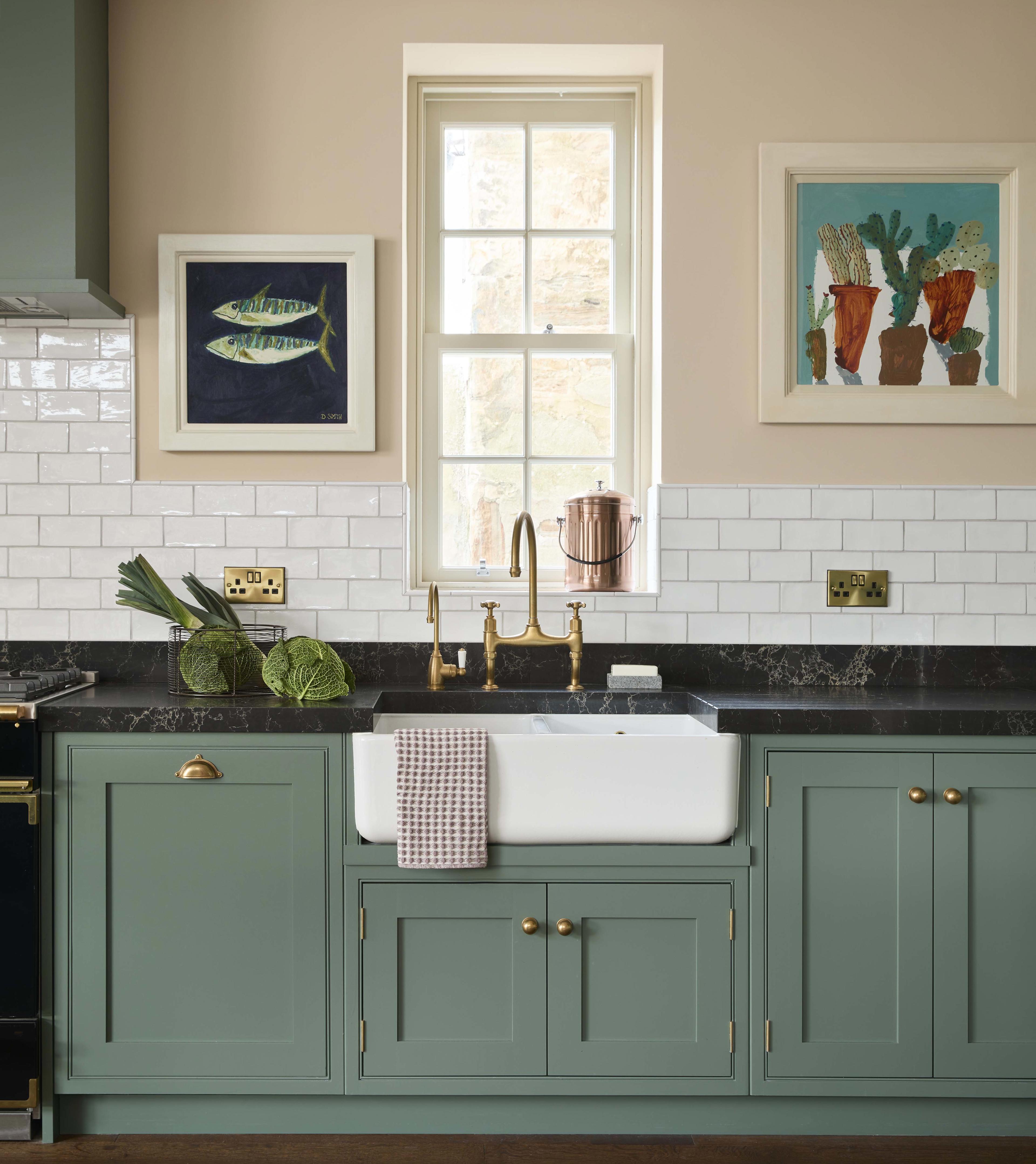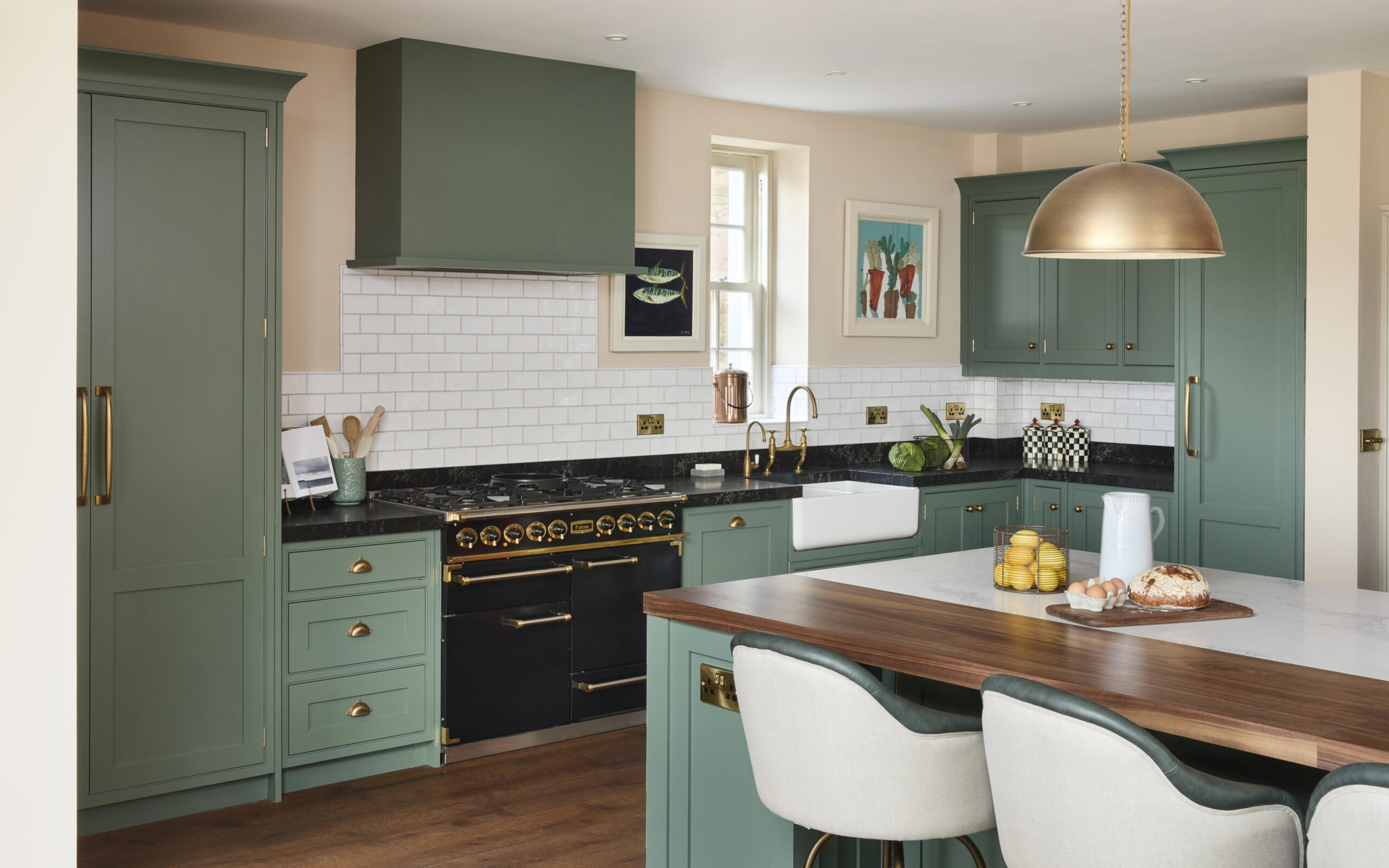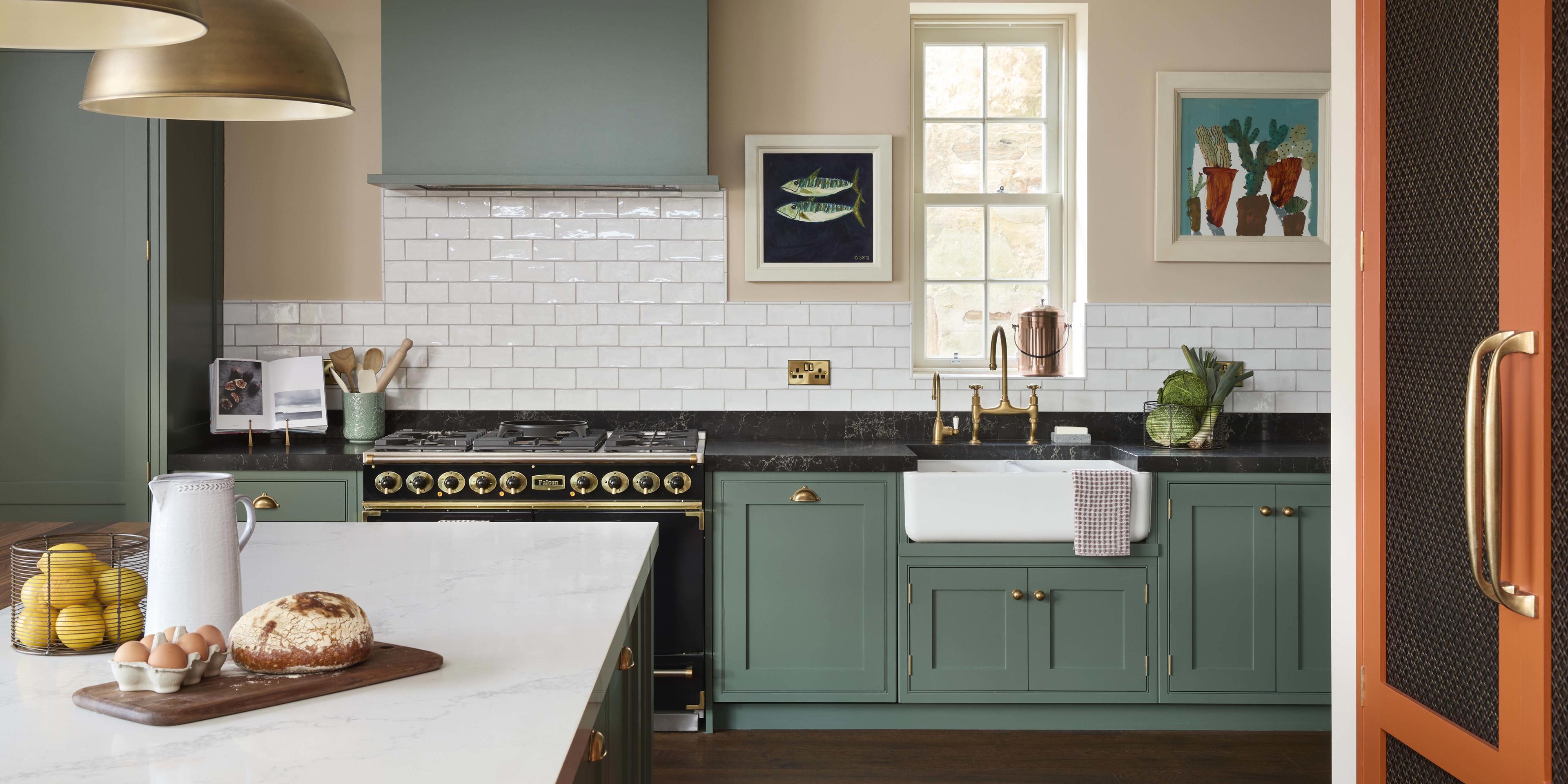 They chose the classic Shaws Double Bowl 800 because of its sleek timeless design and robust practicality, which is only elevated further when fitted with an Aged Brass Ionian Bridge Mixer and Mini Instant Hot Tap from Perrin & Rowe. Traditional Shaker-style cabinetry was commissioned by David L Douglas, and painted in the deep, rich Green Smoke by Farrow and Ball.  The client chose to position the sink under the window, rather than on the island, because they wanted to keep the island clear for hosting and socialising and make the most of a spectacular view. The addition of a large range cooker and the traditional glazed-brick tiles add further to the practical country kitchen aesthetic.