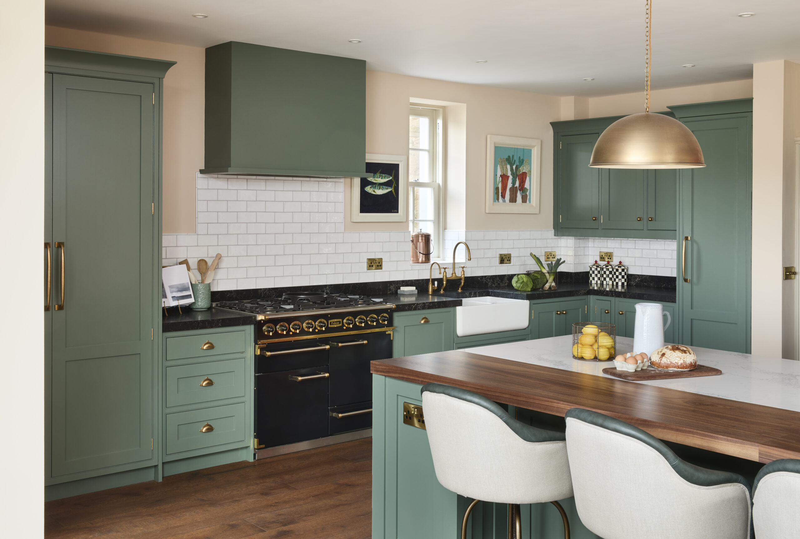 They chose the classic Shaws Double Bowl 800 because of its sleek timeless design and robust practicality, which is only elevated further when fitted with an Aged Brass Ionian Bridge Mixer and Mini Instant Hot Tap from Perrin & Rowe. Traditional Shaker-style cabinetry was commissioned by David L Douglas, and painted in the deep, rich Green Smoke by Farrow and Ball.  The client chose to position the sink under the window, rather than on the island, because they wanted to keep the island clear for hosting and socialising and make the most of a spectacular view. The addition of a large range cooker and the traditional glazed-brick tiles add further to the practical country kitchen aesthetic.