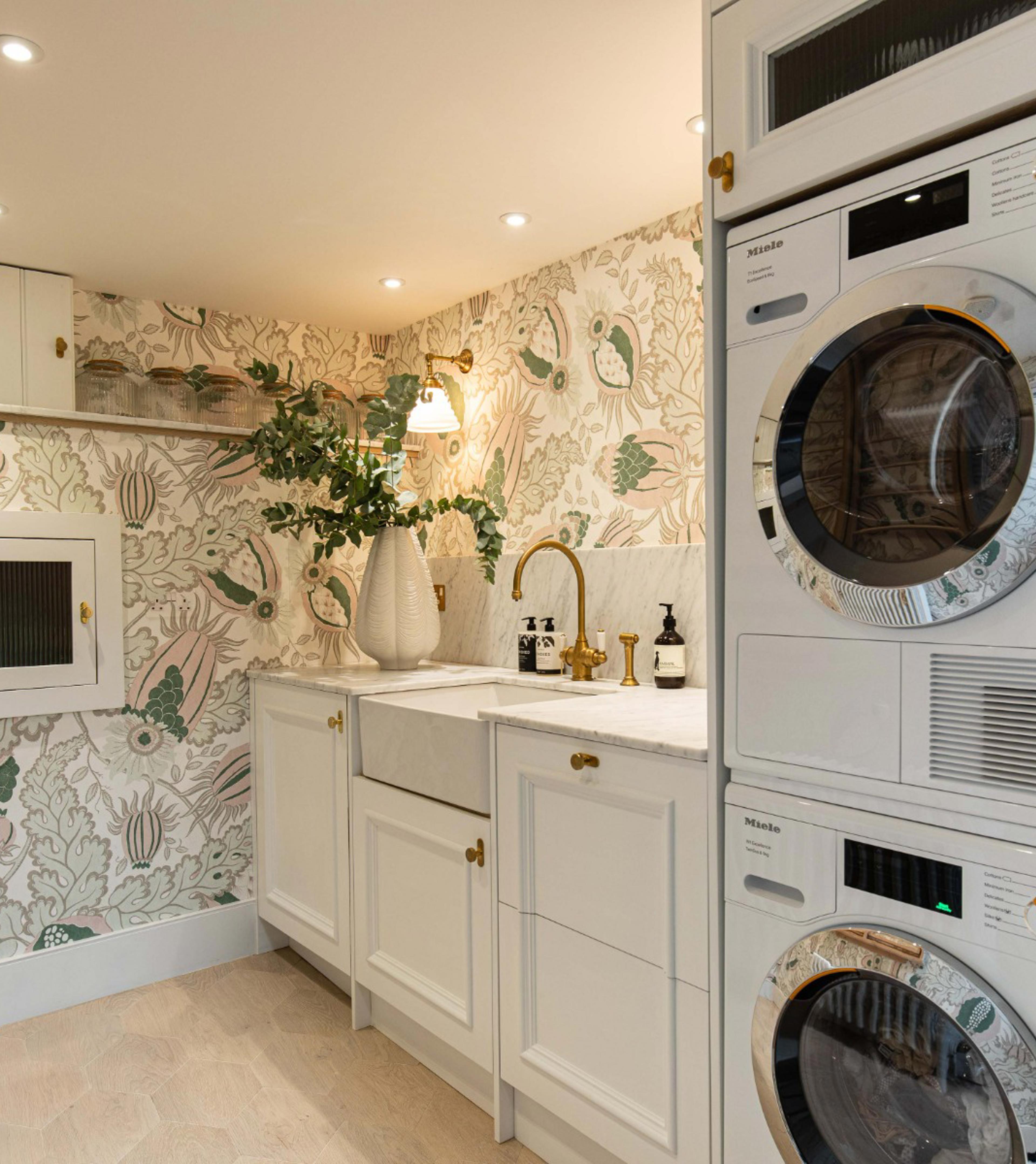 The utility room is one of those rooms where you can really add your own personality and be daring and fun. In this laundry room by Laura Butler-Madden, striking ‘Carnival’ wallpaper by Christopher Farr Cloth is quite literally the star of the show. When Laura and her husband bought the house this space was a ‘cave with an old stone sink’, but the couple have managed to convert it into a luxurious utility complete with Miele appliances, a Shaws of Darwen fireclay sink and Perrin & Rowe Polaris 3-in-1 instant hot tap with rinse in aged brass.
