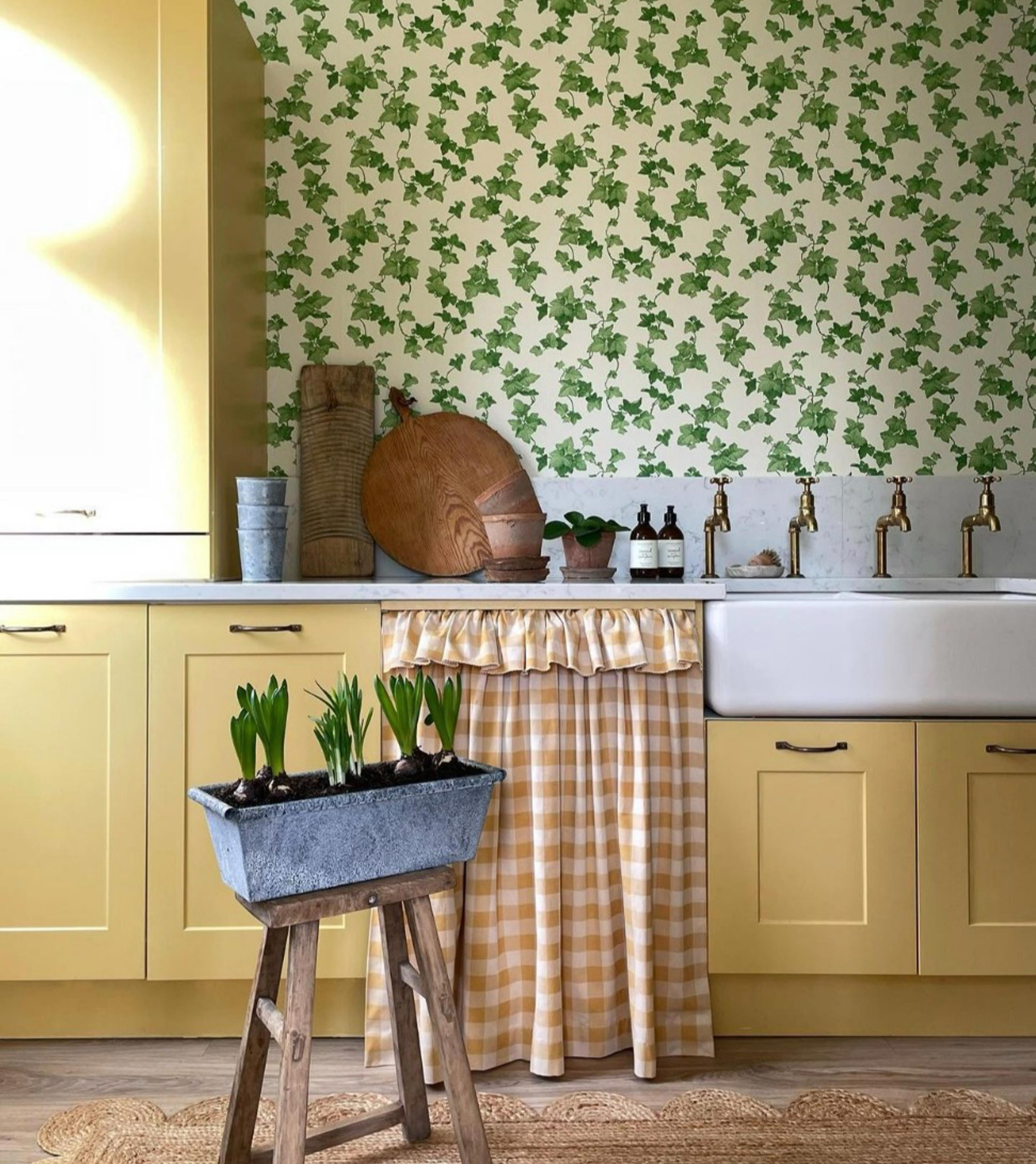 Full of the joys of spring, this utility room by Megan of @kitandco is so bright and breezy. It combines Sanderson Hedera Green wallpaper with not two but four aged brass deVOL Mayan taps, made exclusively for deVOL by Perrin & Rowe. Paired with a Shaws of Darwen Double Bowl 800 sink, each bowl has its own set of taps for ultimate usability. This room is the owner’s favourite room in the house, and doubles up as a potting room too.