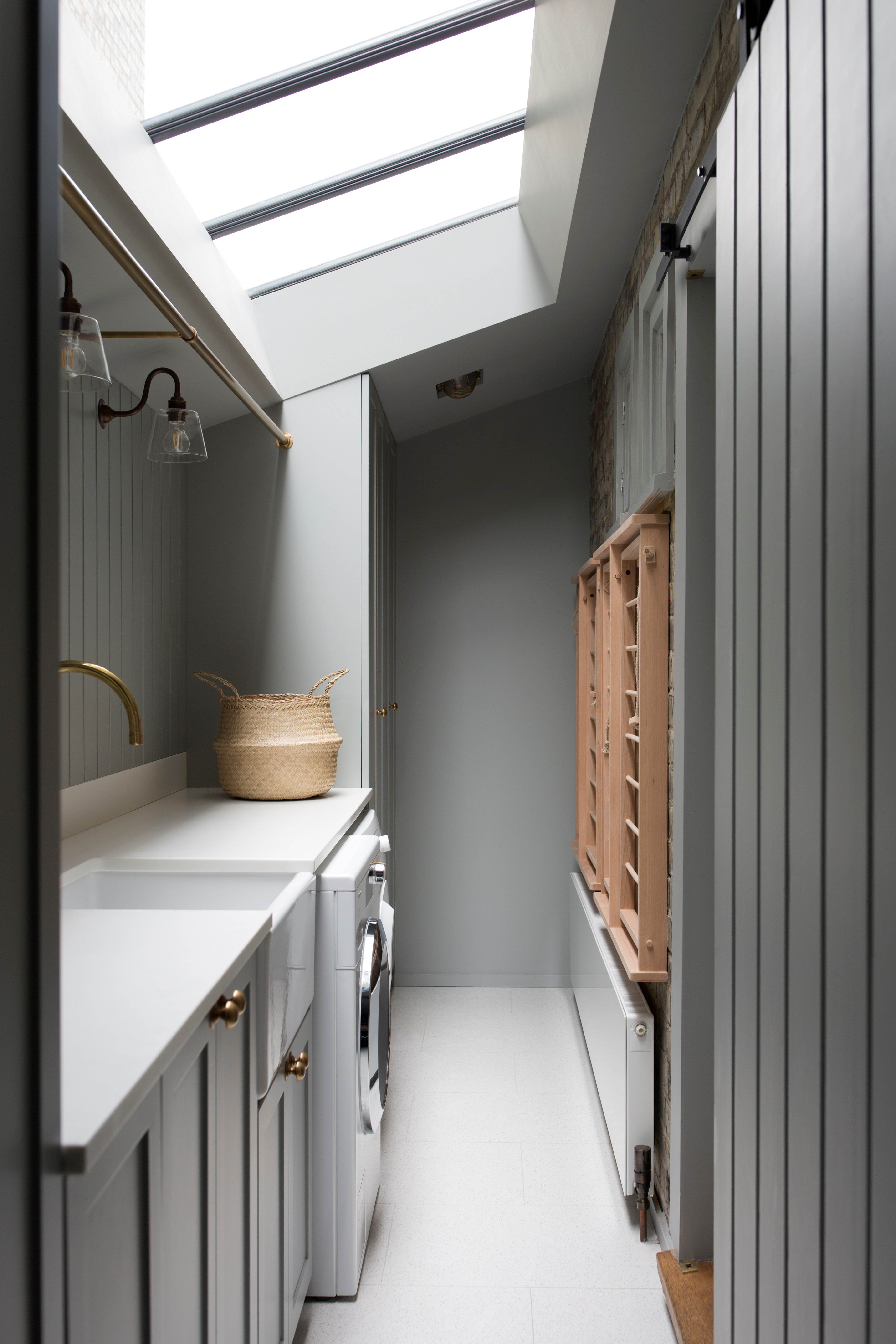 Utility rooms are often considered fairly dark spaces, located in the middle of the home with no natural light. The utility room in this design by interior designer Laura Binns is narrow, yet a skylight floods the space with natural light. Clever storage solutions means every inch of space has been utilised, proving that a utility room doesn't have have to be huge to be beautiful. A Shaws of Darwen Butler sink is the perfect hardworking utility room sink.