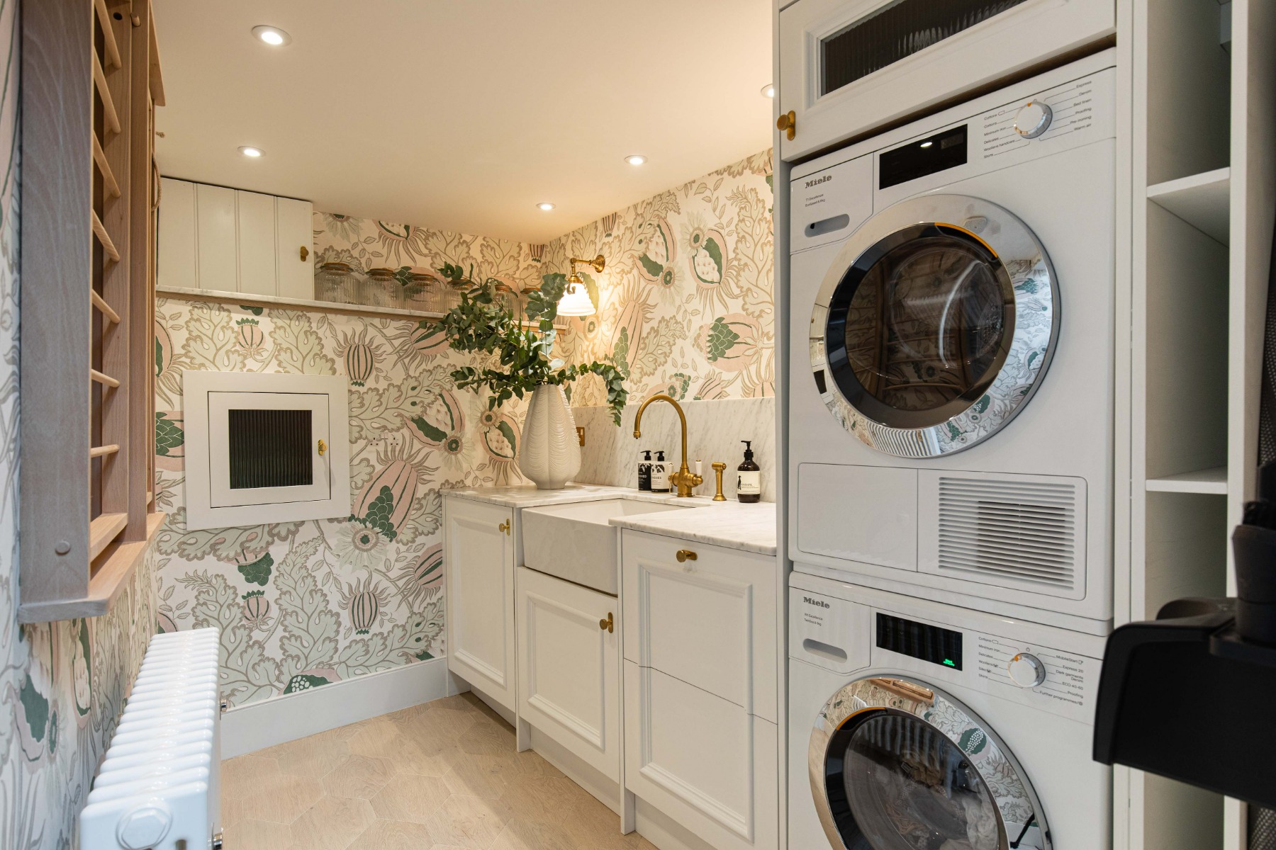 The utility room is one of those rooms where you can really add your own personality and be daring and fun. In this laundry room by Laura Butler-Madden, striking ‘Carnival’ wallpaper by Christopher Farr Cloth is quite literally the star of the show. When Laura and her husband bought the house this space was a ‘cave with an old stone sink’, but the couple have managed to convert it into a luxurious utility complete with Miele appliances, a Shaws of Darwen fireclay sink and Perrin & Rowe Polaris 3-in-1 instant hot tap with rinse in aged brass.