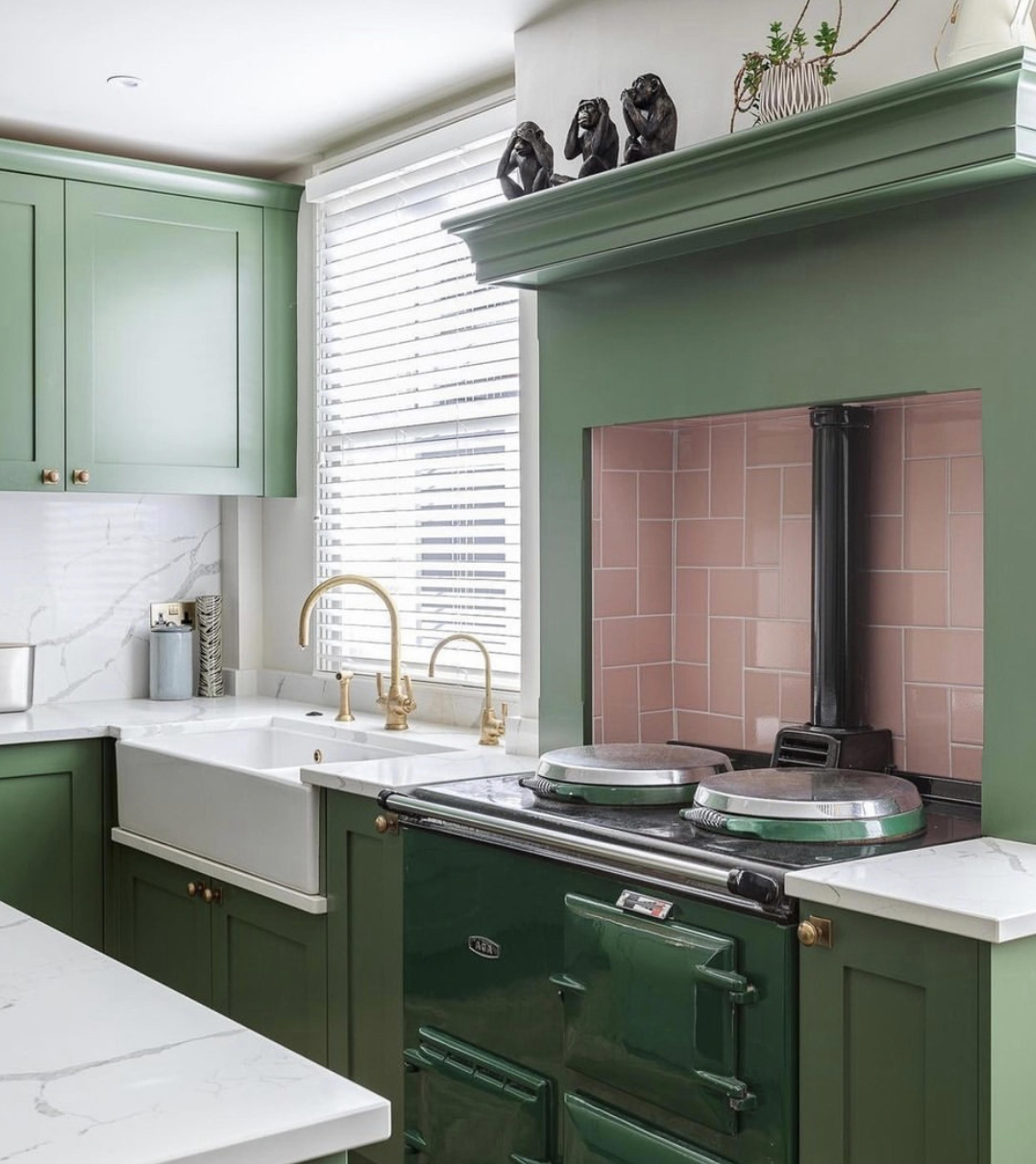 In this striking kitchen by designed by Planet Furniture, pink metro tiles soften the moss green cabinetry and range cooker and work wonderfully with our Mimas mixer, rinse and mini instant hot tap in satin brass.