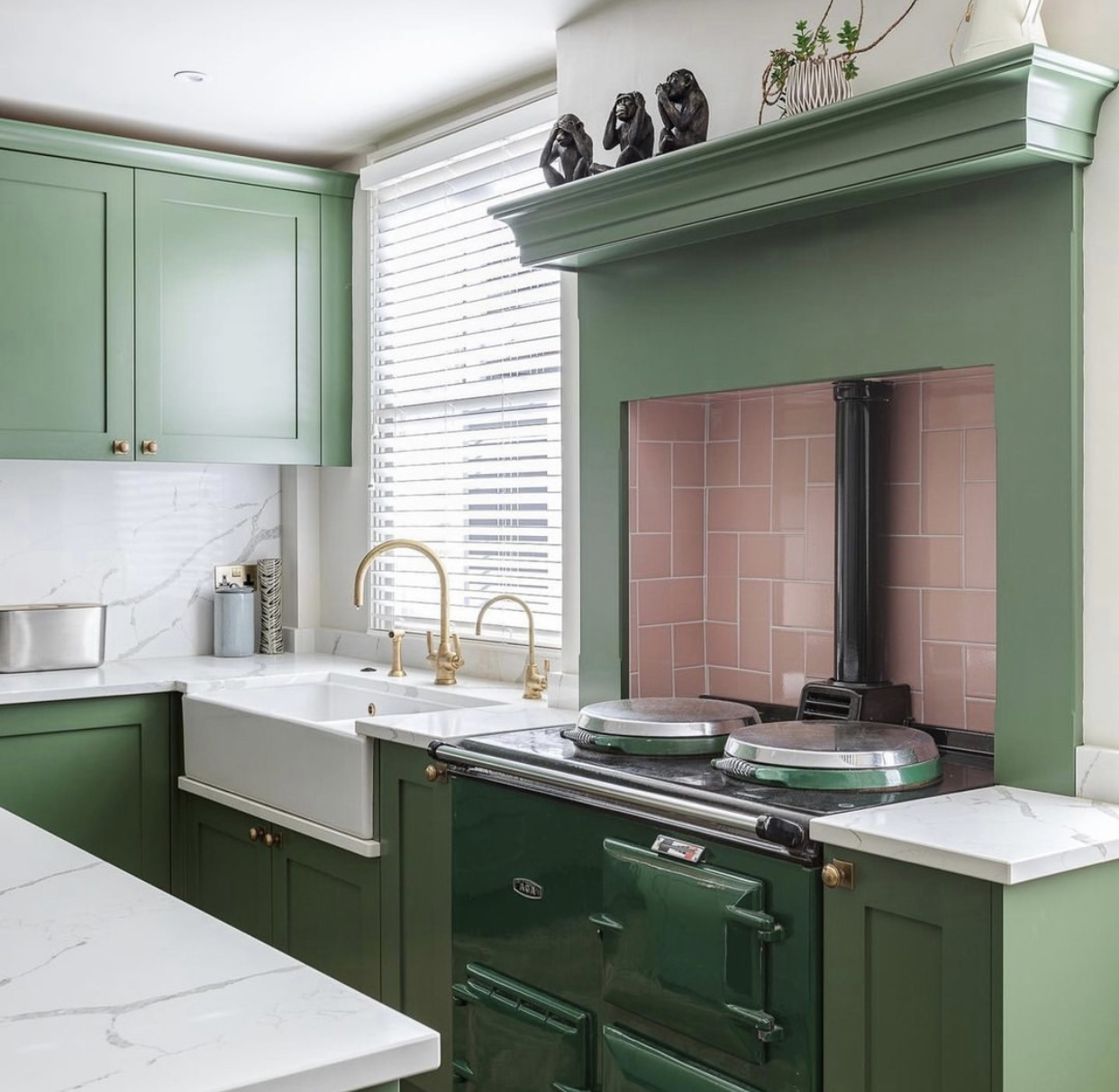 In this striking kitchen by designed by Planet Furniture, pink metro tiles soften the moss green cabinetry and range cooker and work wonderfully with our Mimas mixer, rinse and mini instant hot tap in satin brass.