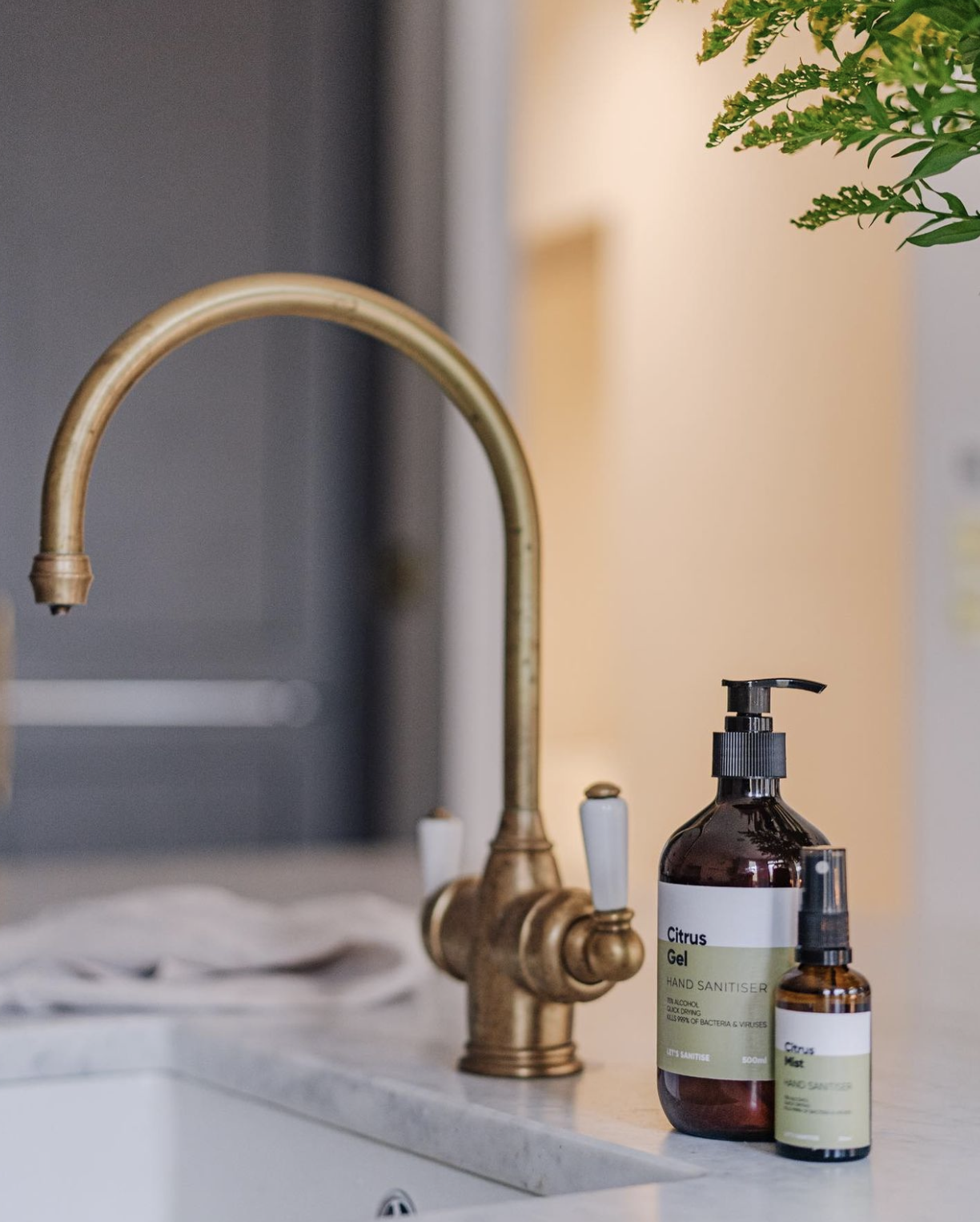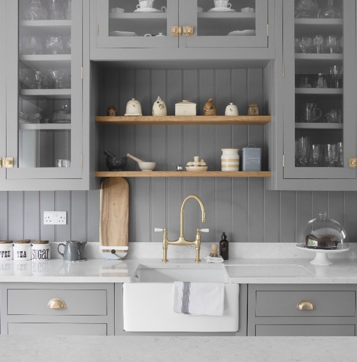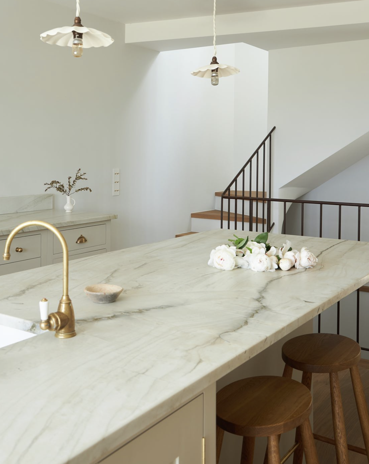 This bespoke, hand-painted kitchen by Lund & Law features plenty of storage and our Ionian mixer in satin brass with porcelain lever handles. A cool, crisp colour palette managed to feel incredibly inviting.