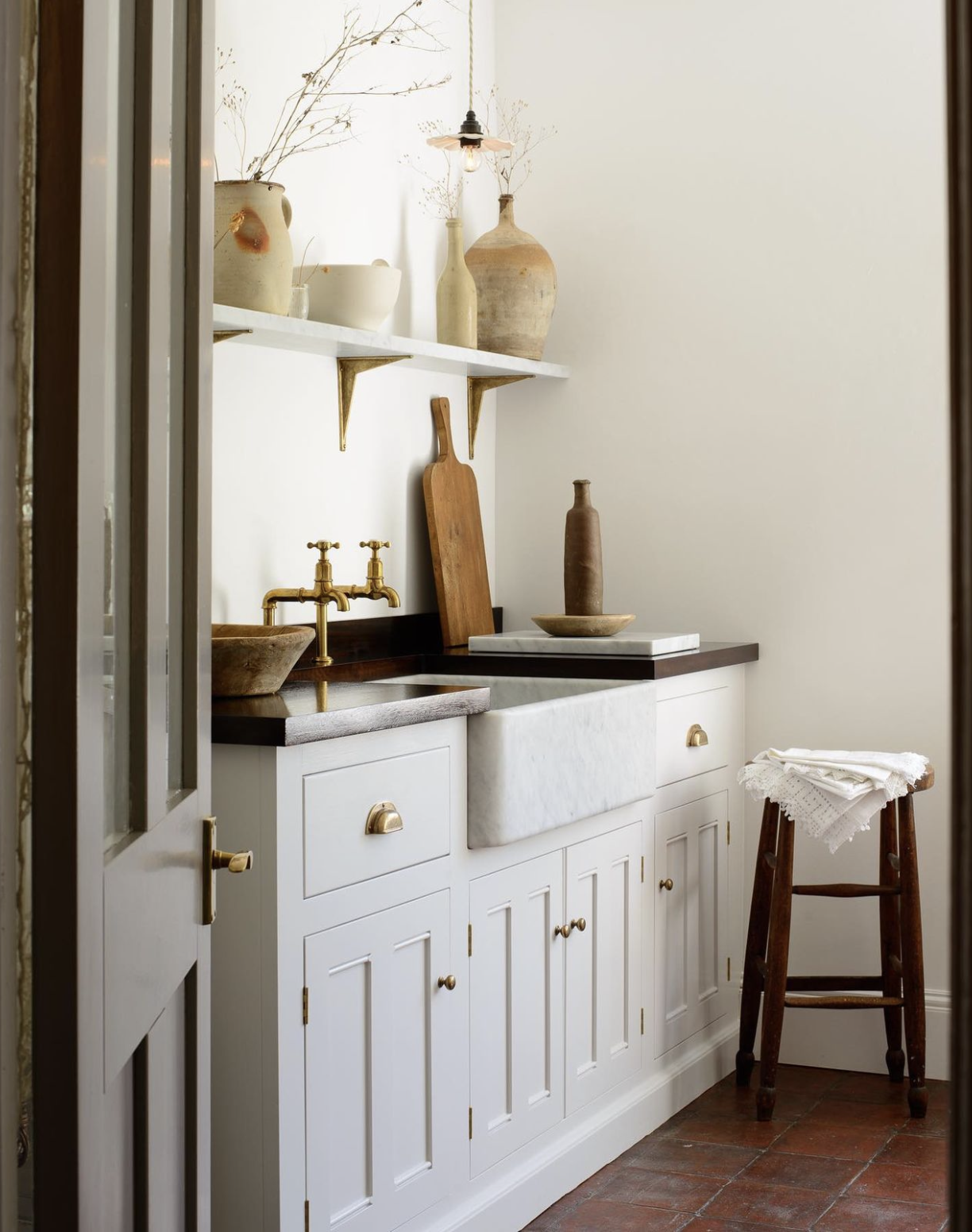 This deVOL design is a celebration of craftsmanship; warm and welcoming with material at its heart. The handles and brackets have been aged at the deVOL mill, while the porcelain pendant is handcrafted at its ceramic studio. The bibcock taps from the Ionian collection are crafted by Perrin & Rowe at our UK foundry and finished in an exclusive aged brass finish. The vintage pots and stool are sold by deVOL.