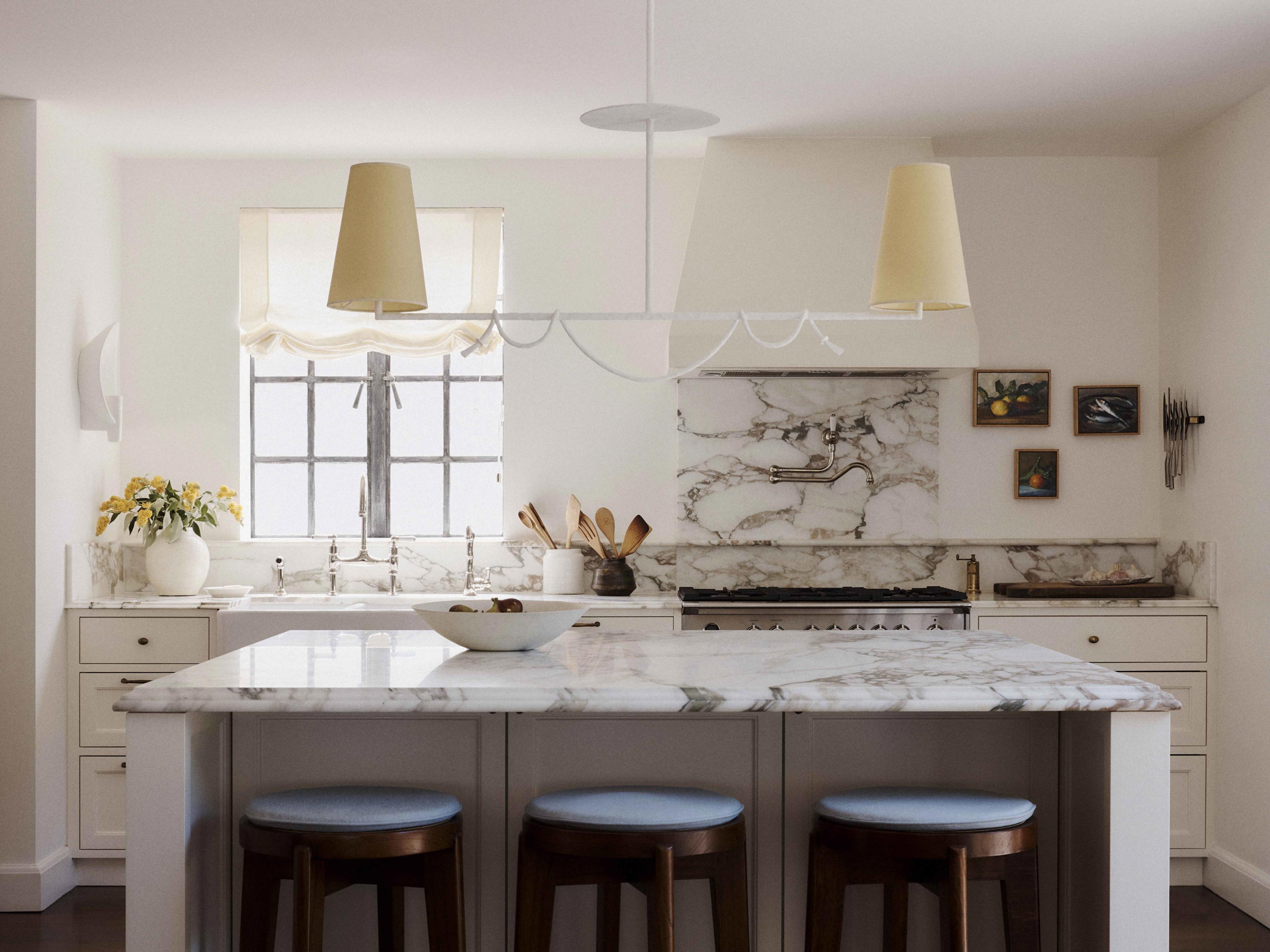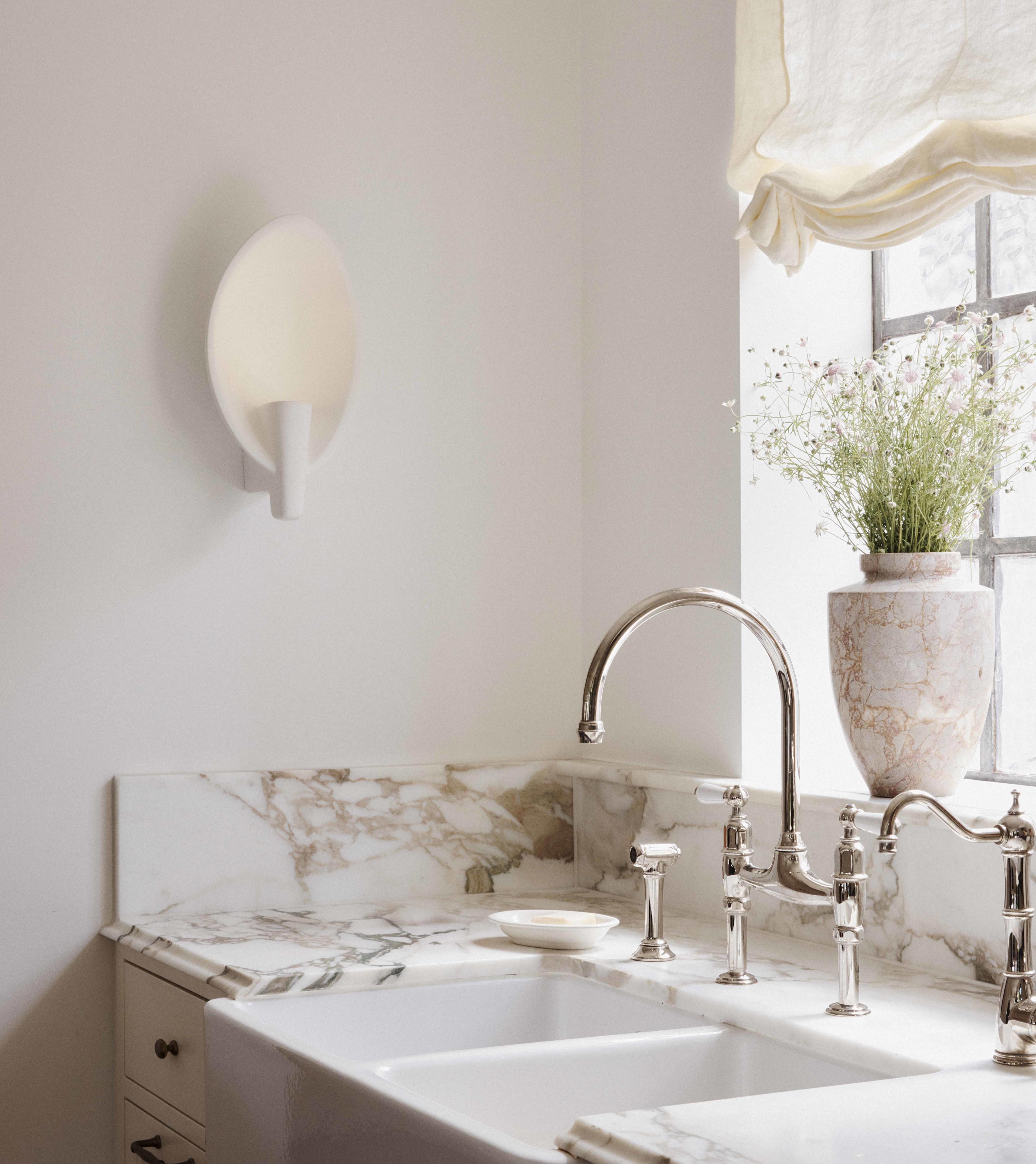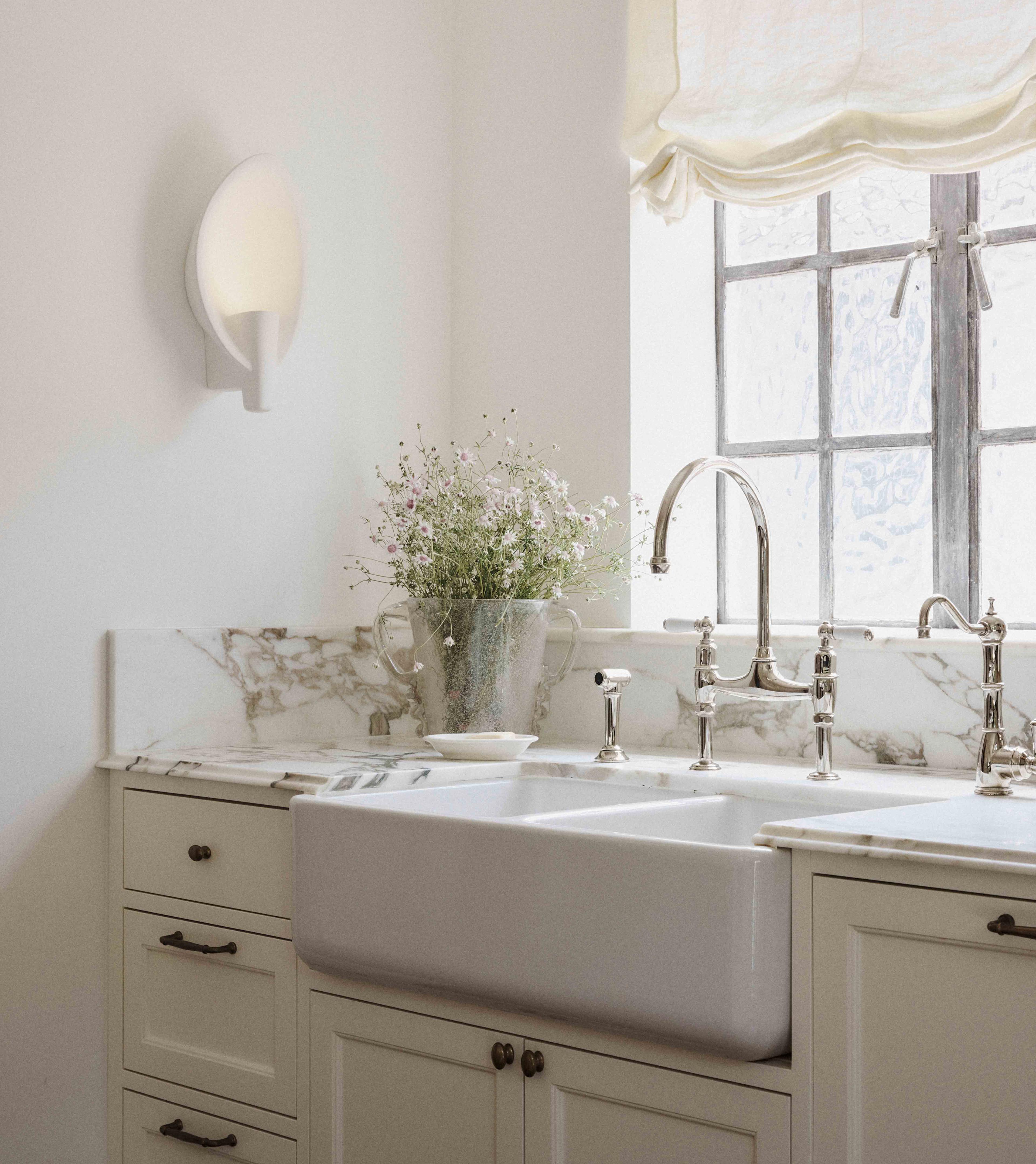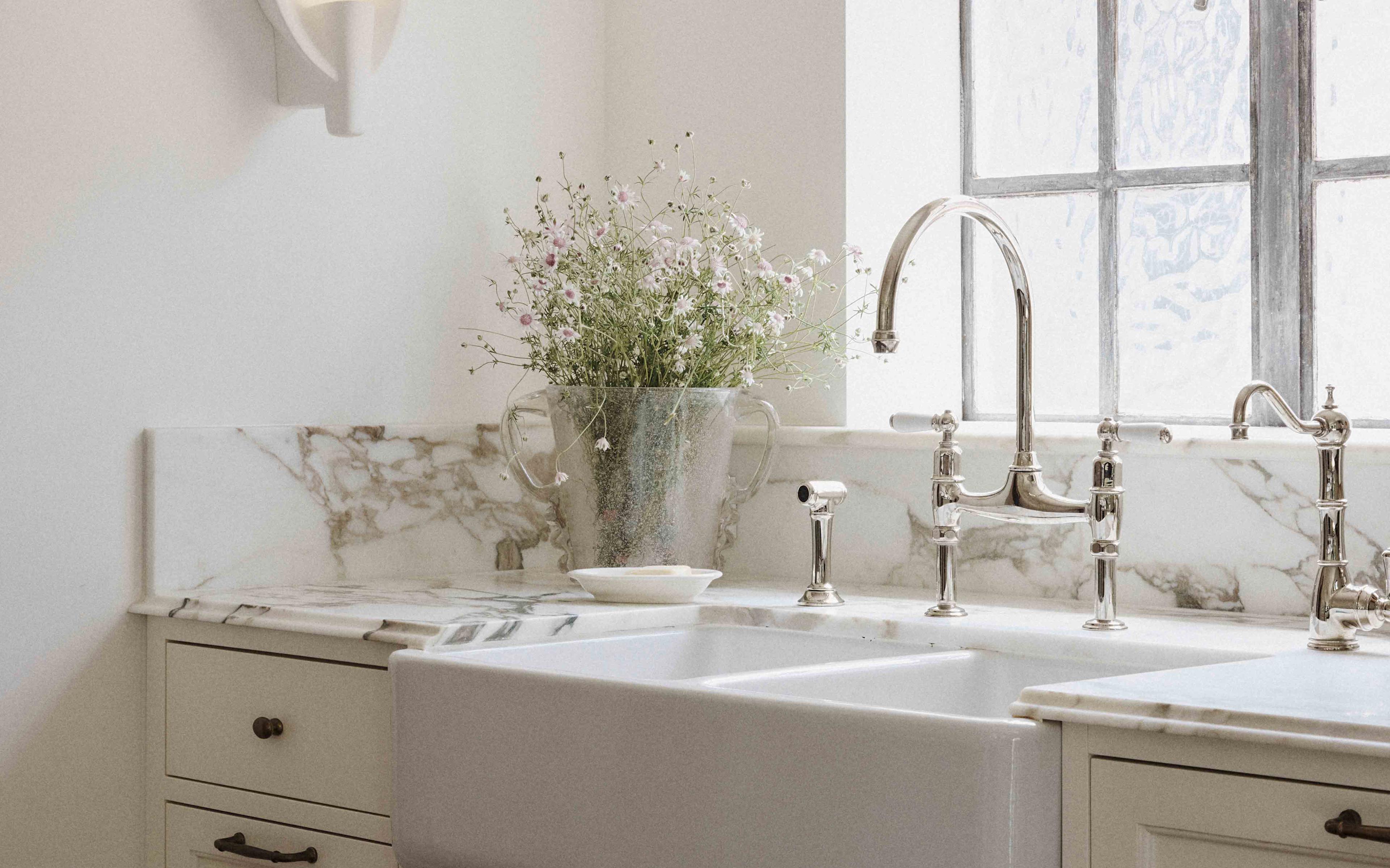 Designer Phoebe Nichol incorporated nods to the architectural history of the 1925 Wallaroy Road home. The newly designed kitchen features a beautiful Shaws of Darwen Double Bowl 800 kitchen sink alongside a Perrin & Rowe Ionian tap and rinse in a warm Nickel finish, which add layers of texture and feel sympathetic to the original features of the home.