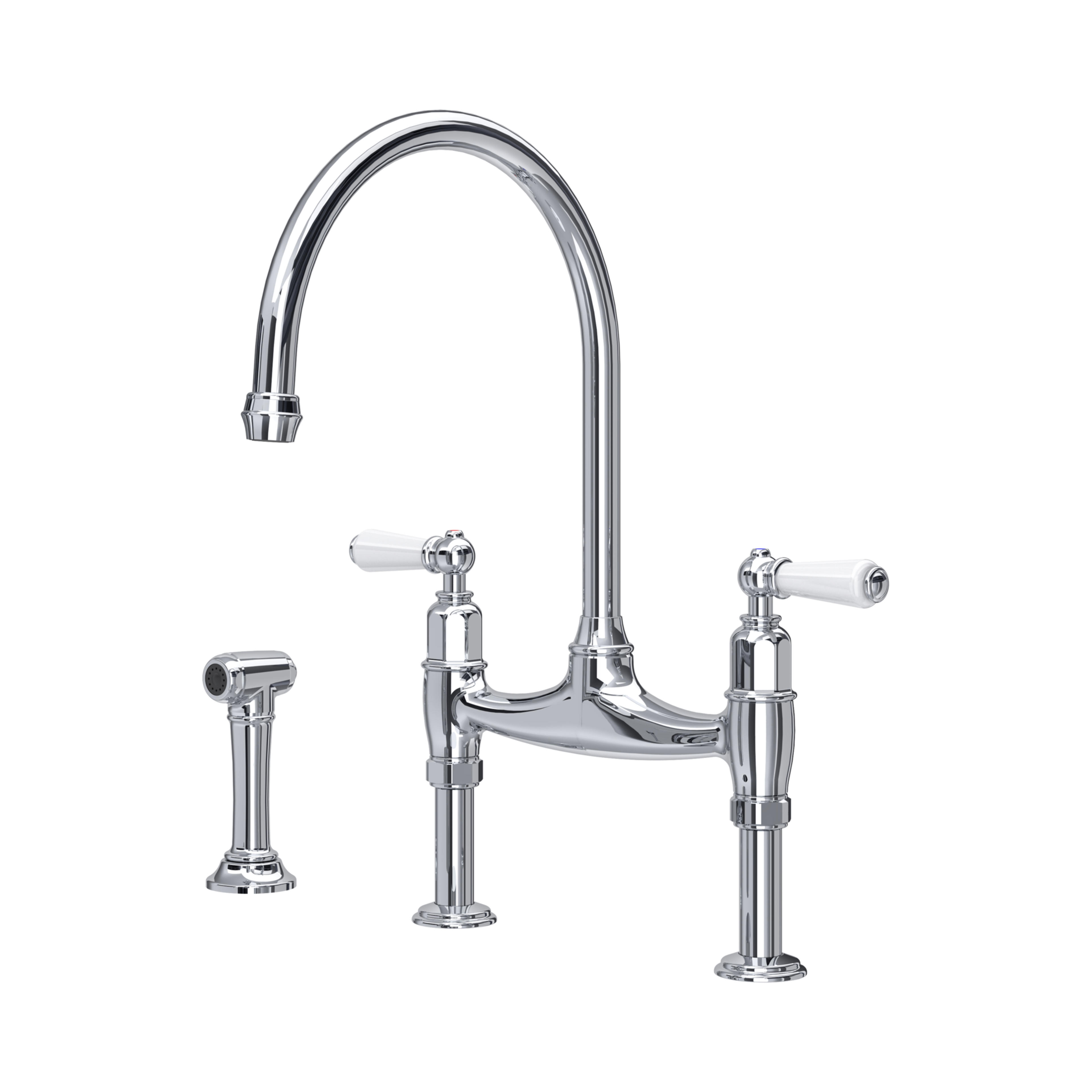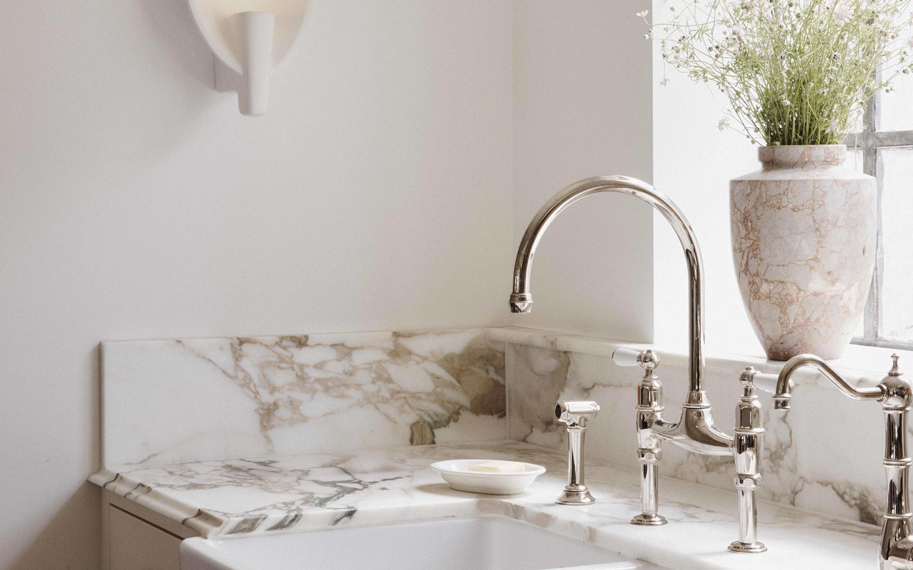 A Perrin & Rowe mini instant hot tap from the Provence collection sits alongside the Ionian bridge mixer, proof that combining two taps from different collections can work perfectly.