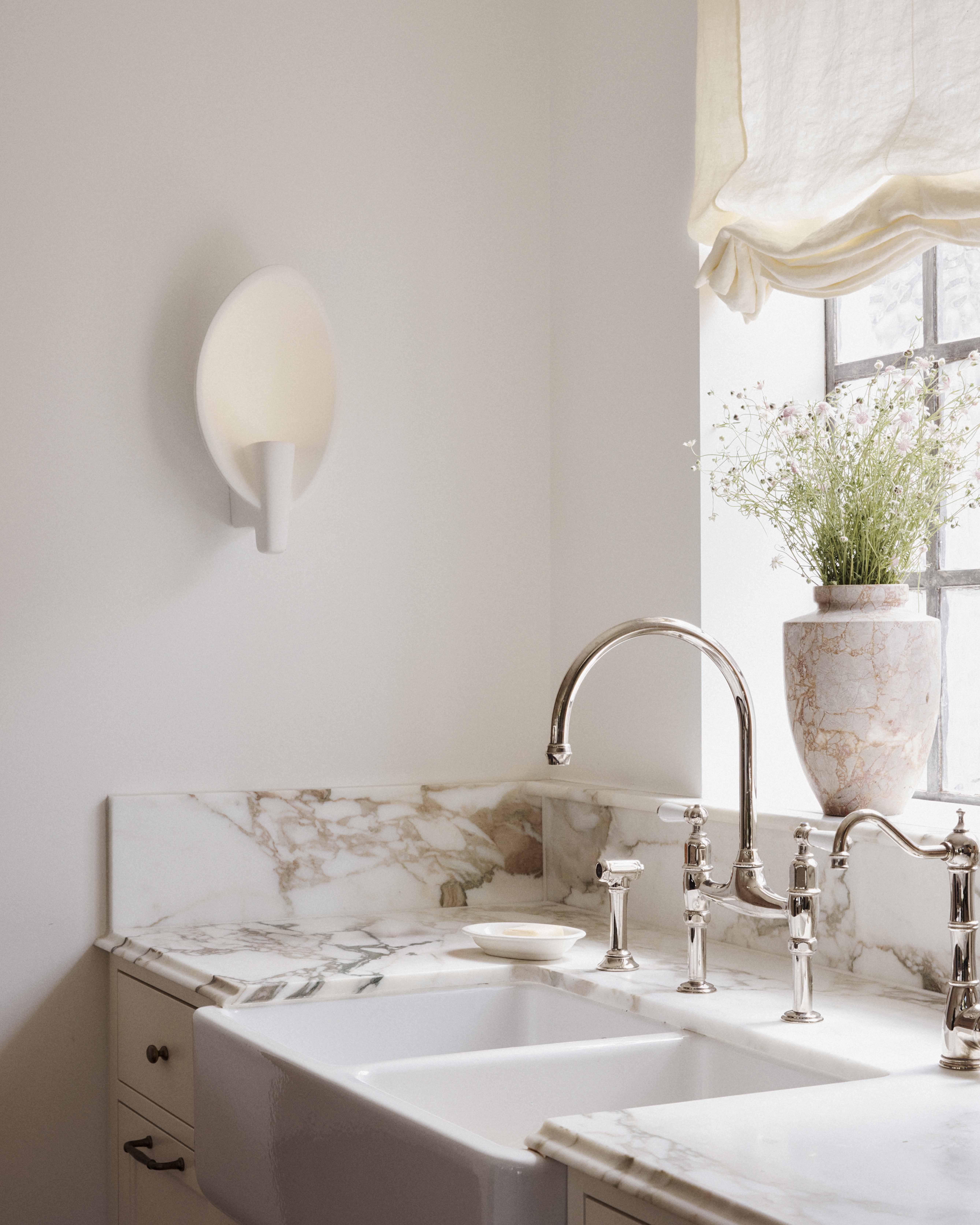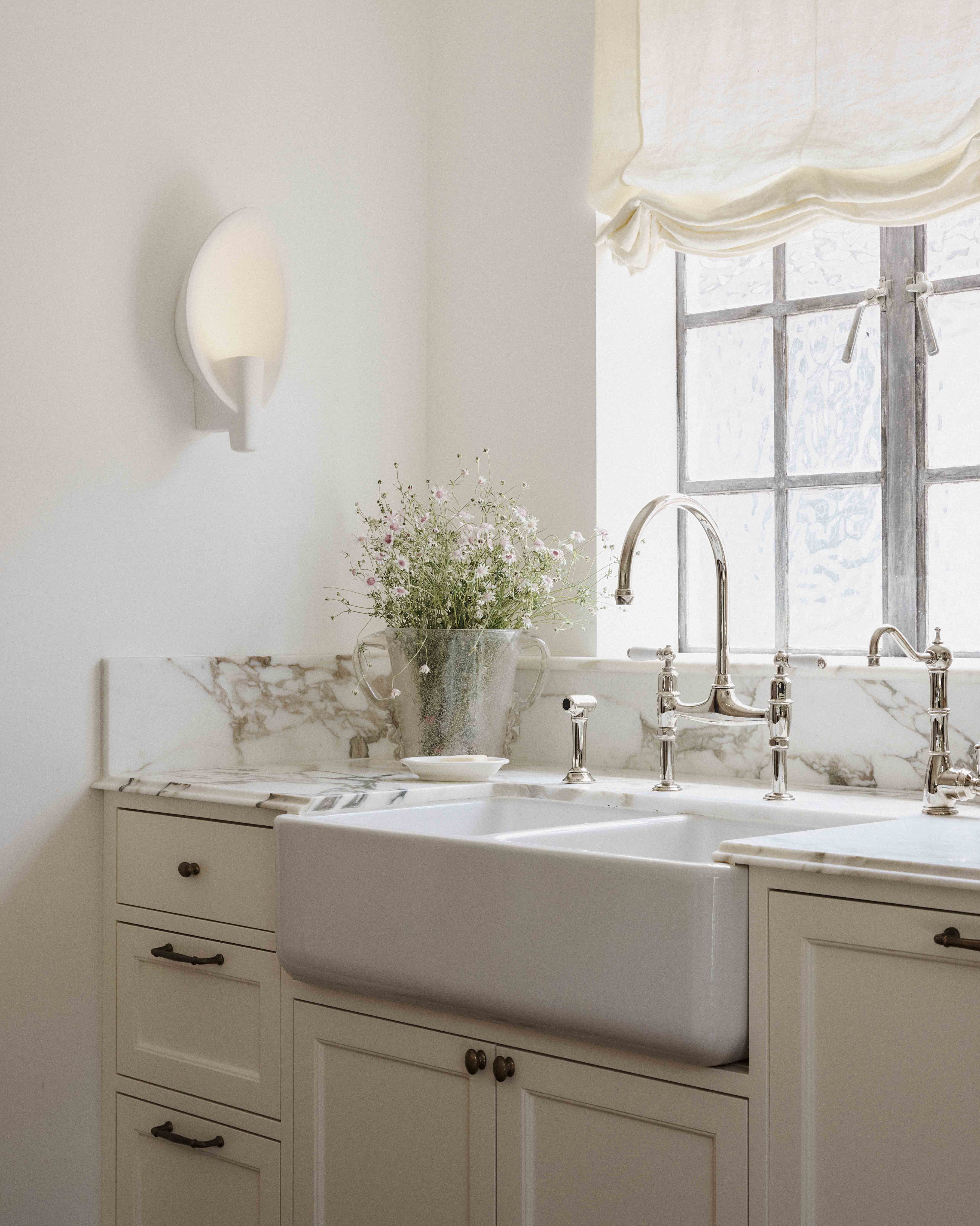 Designer Phoebe Nichol incorporated nods to the architectural history of the 1925 Wallaroy Road home. The newly designed kitchen features a beautiful Shaws of Darwen Double Bowl 800 kitchen sink alongside a Perrin & Rowe Ionian tap and rinse in a warm Nickel finish, which add layers of texture and feel sympathetic to the original features of the home.