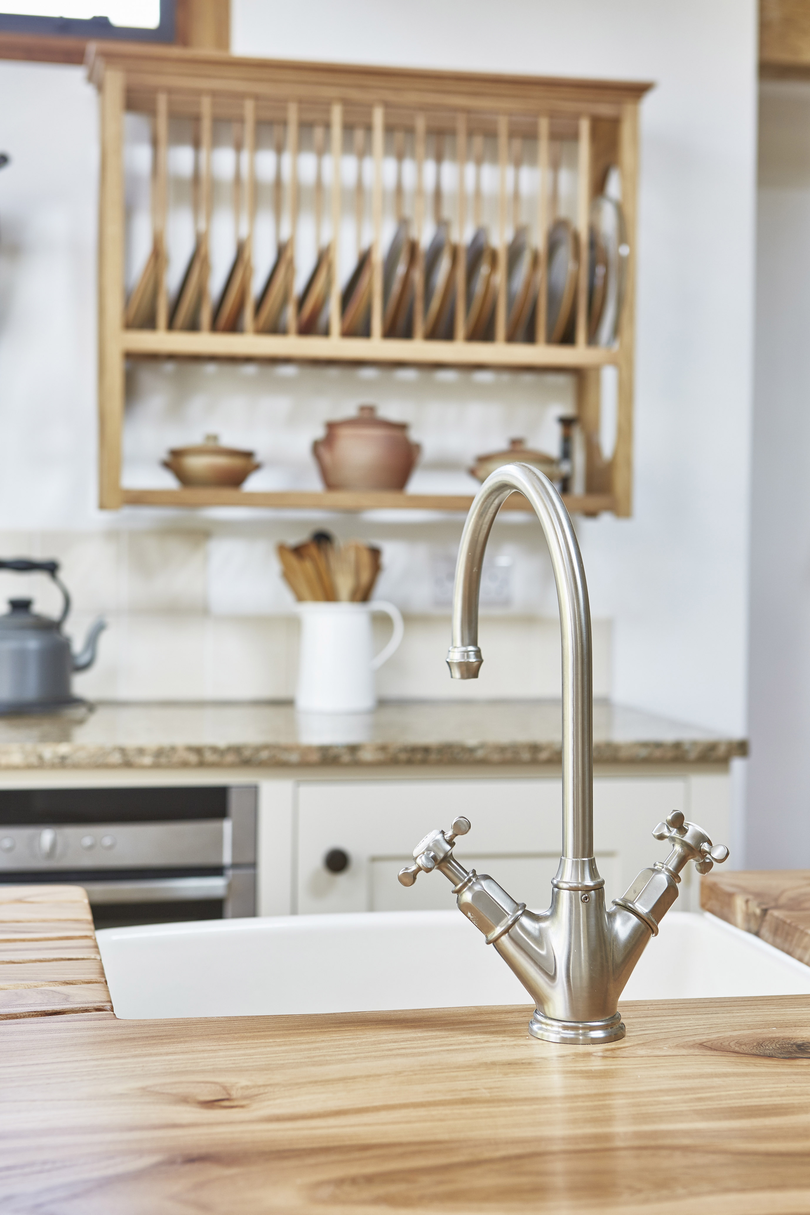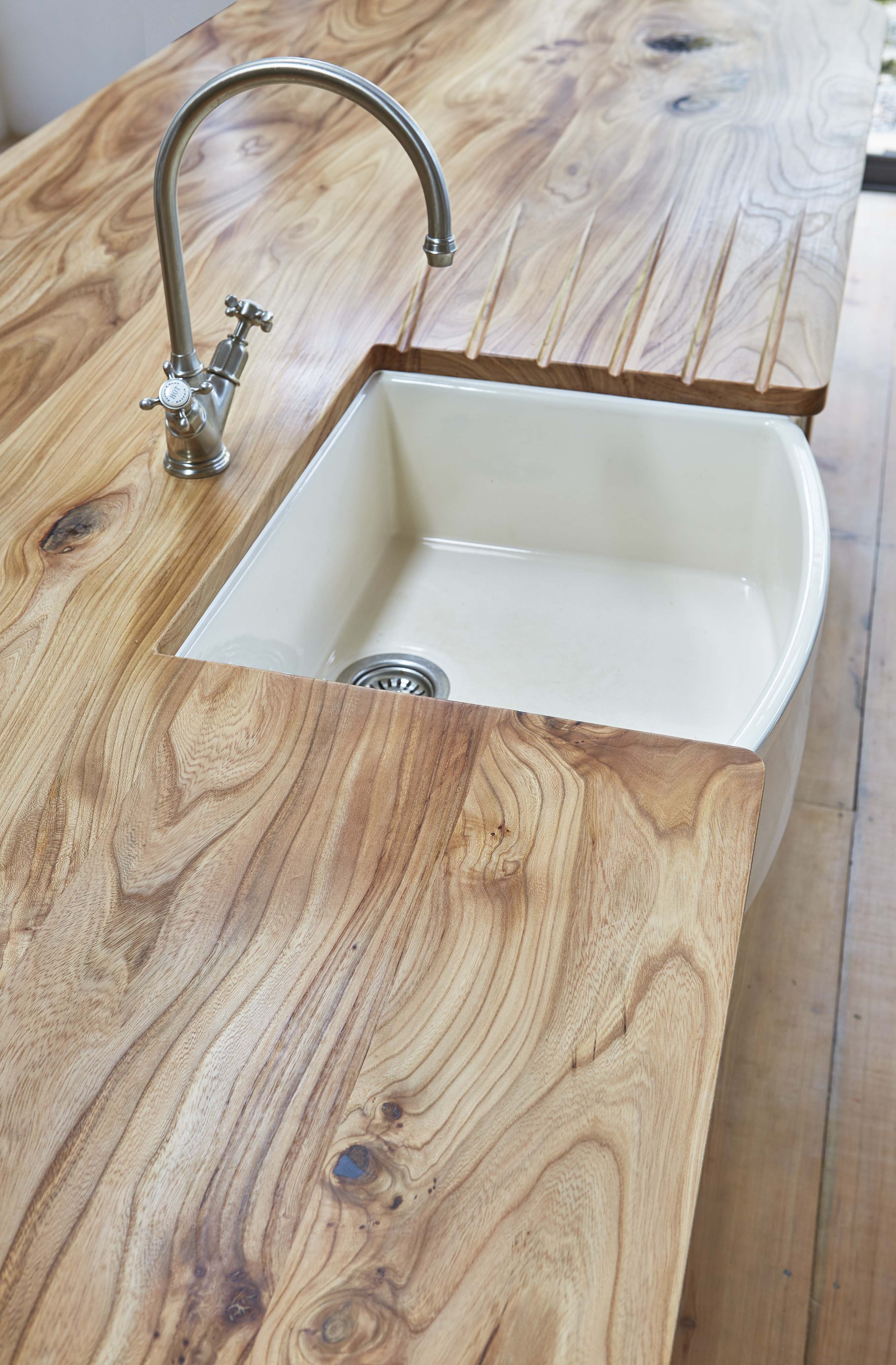 The owners wanted to retain the existing sink – an elegant bow-fronted Waterside 600, which they had become very fond of over the years. Shaws sinks are handmade using heavy duty fireclay, and are incredibly durable. The Waterside 600 sink was refurbished to remove any patina earned by its many years of hard work.