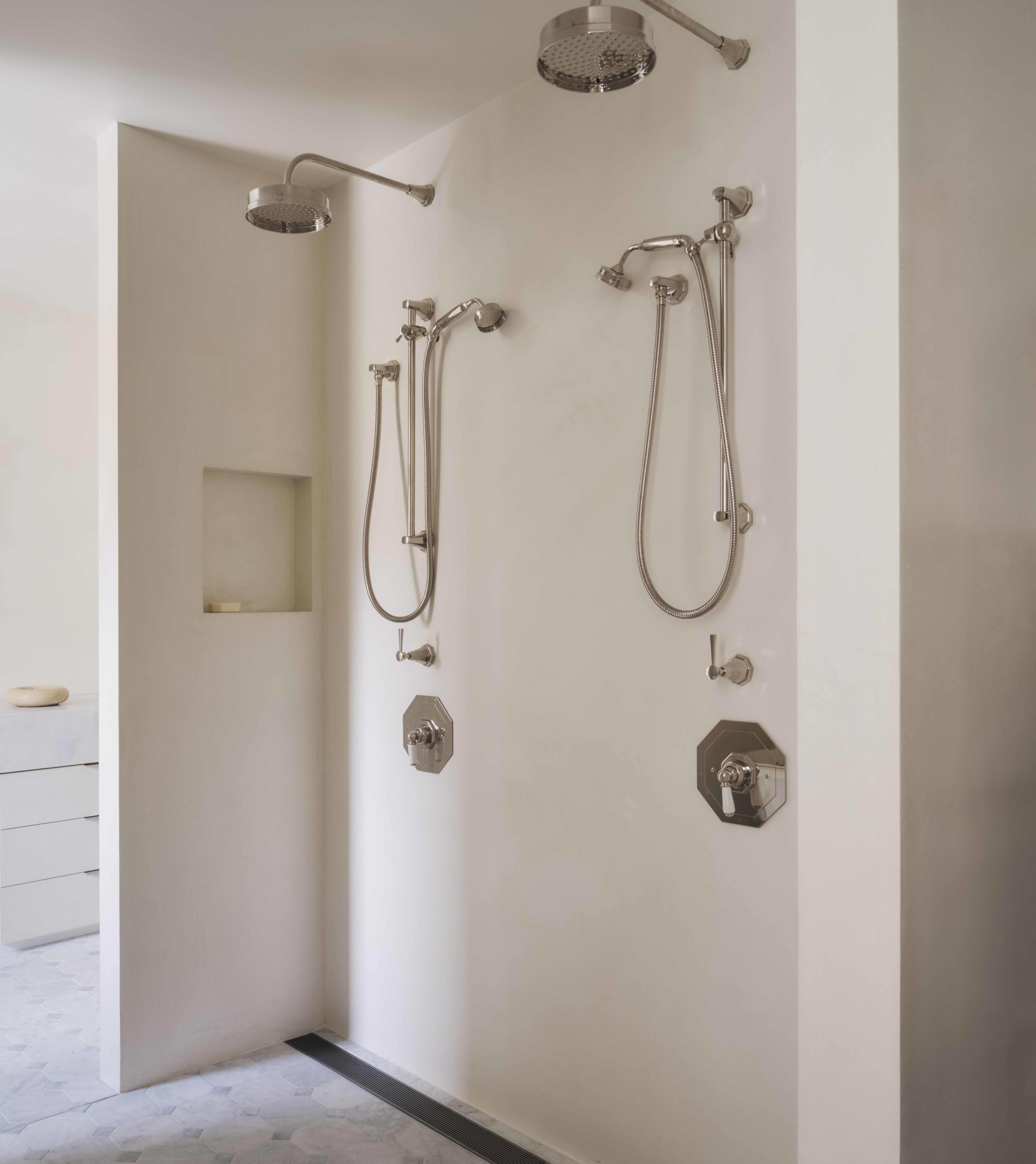 Twin showers are a practical luxury in the master bathroom, as is the York bath from Victoria + Albert paired with a wall-mounted bath filler. Elsewhere, Phoebe Nicol has proved less can sometimes be more as simplistic shower sets have been specified - showing off the Deco collection in all it's beauty.