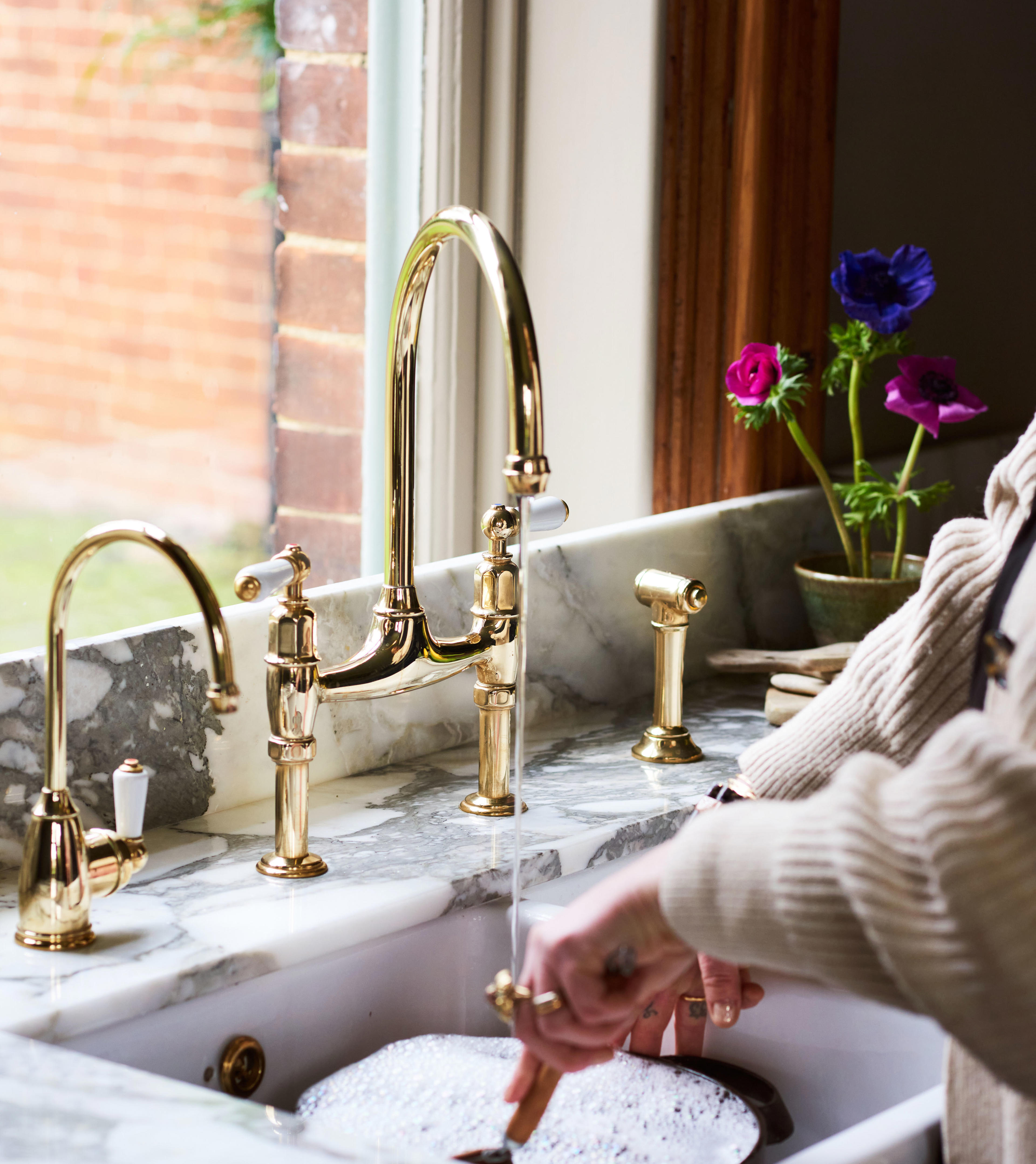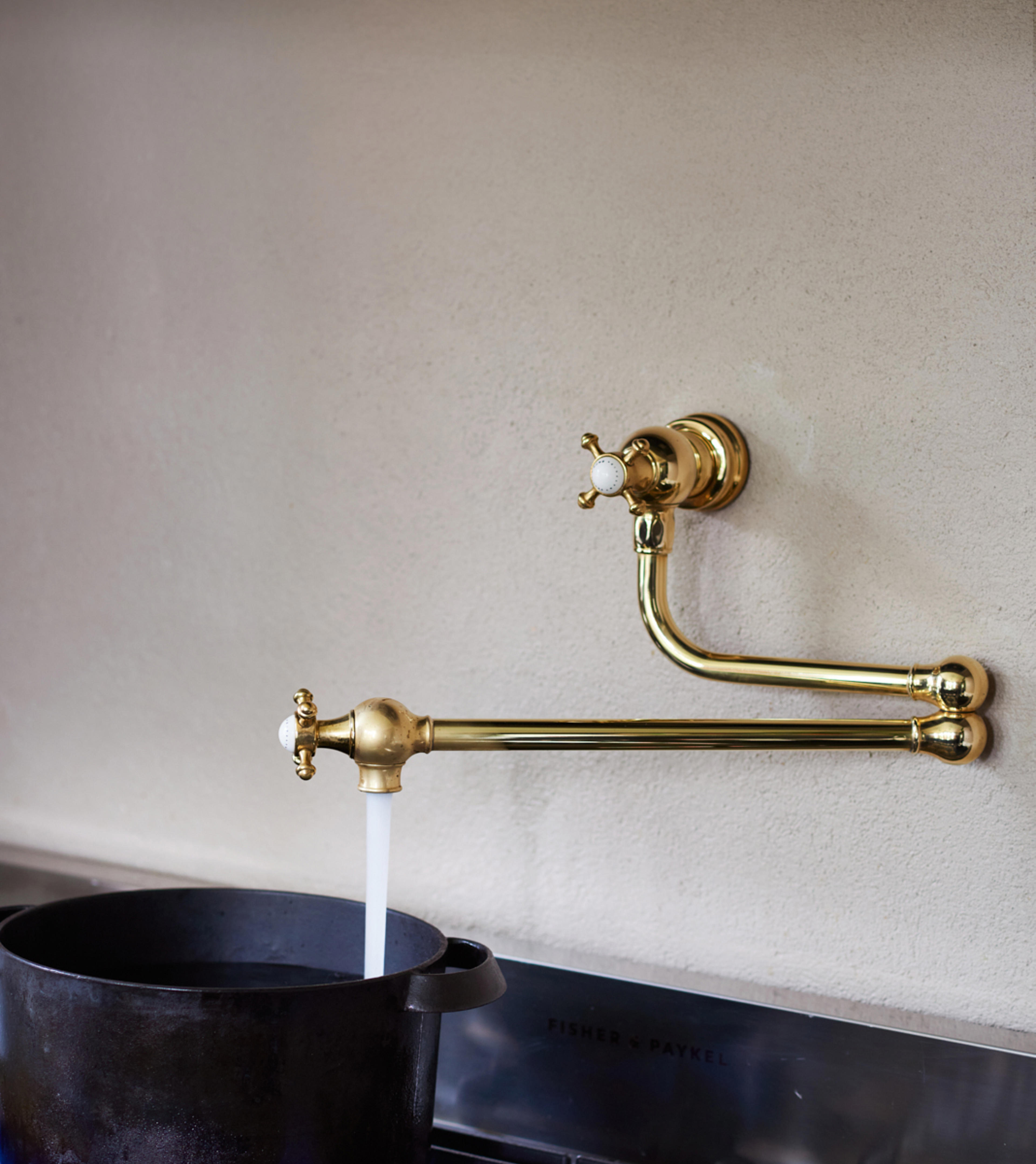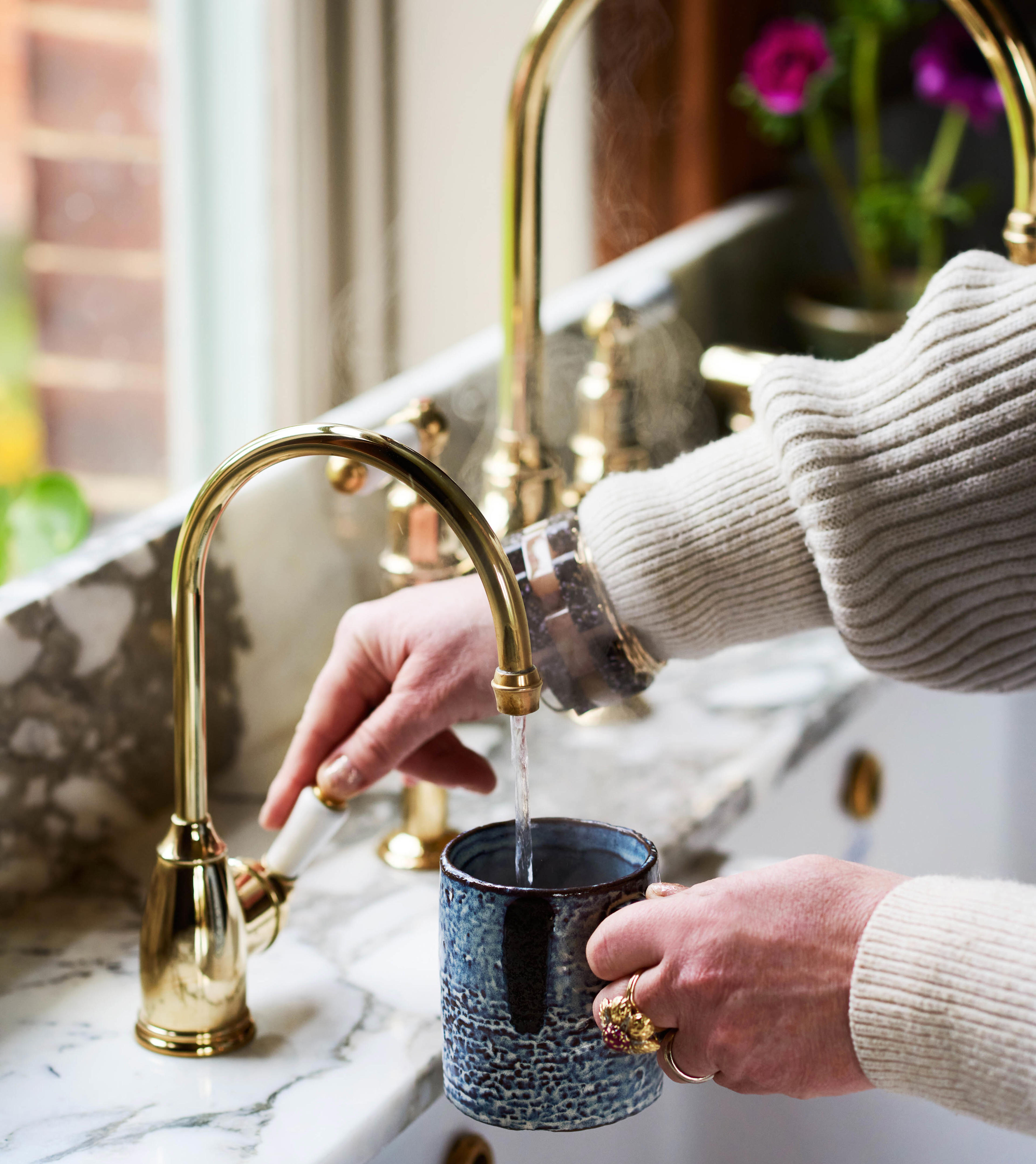 "The Perrin & Rowe instant hot water tap makes making a cup of tea so much easier, no longer do I hang around waiting for the kettle to boil! The pan filling tap above the stove is not only aesthetically pleasing but also makes cooking easier and takes the pain out of carrying pans of water across the kitchen to your stove. The beautiful brassware is easy to clean and the look elevates my entire stove area. We polish it every week and it's such a joy to see it shine."