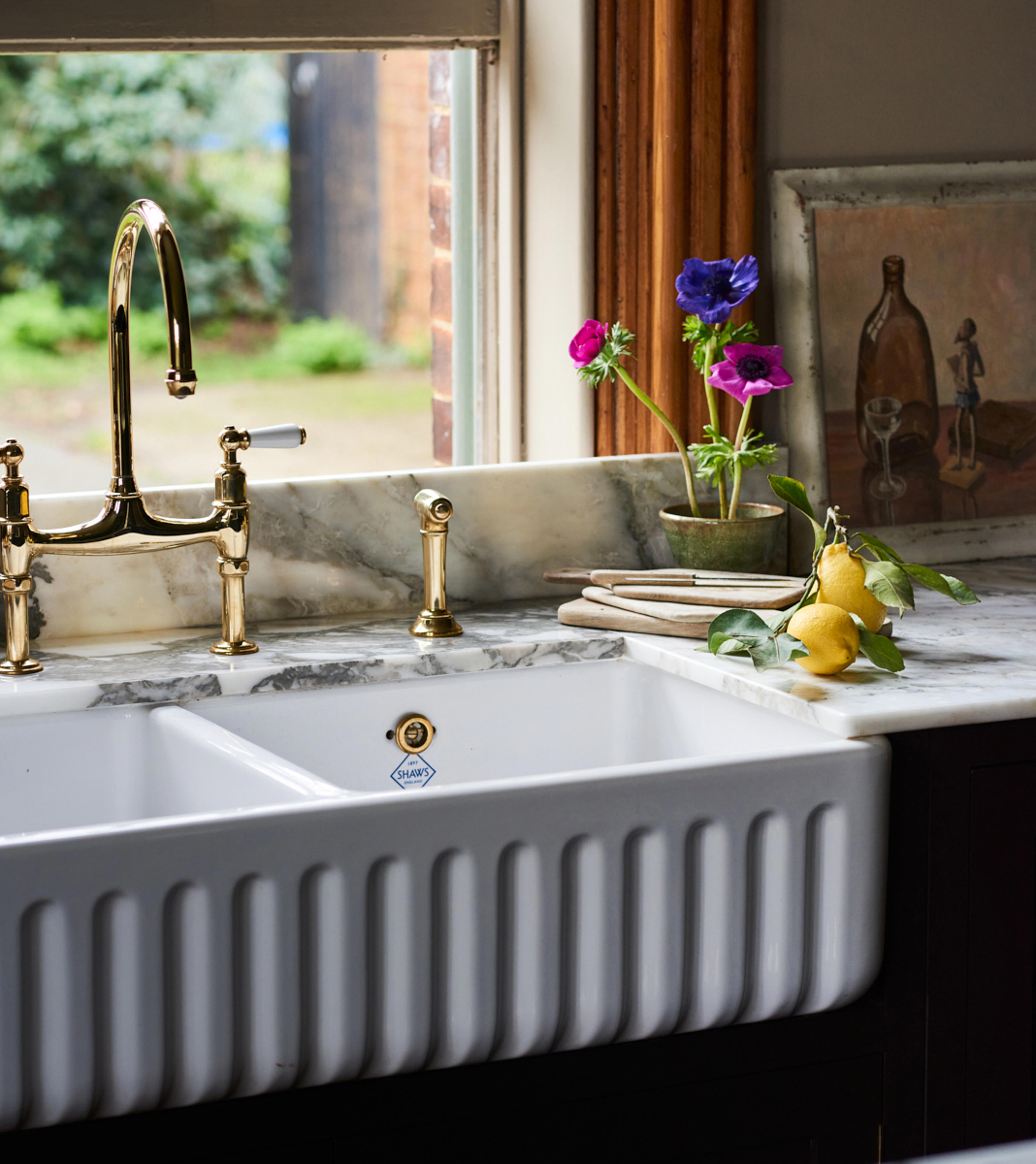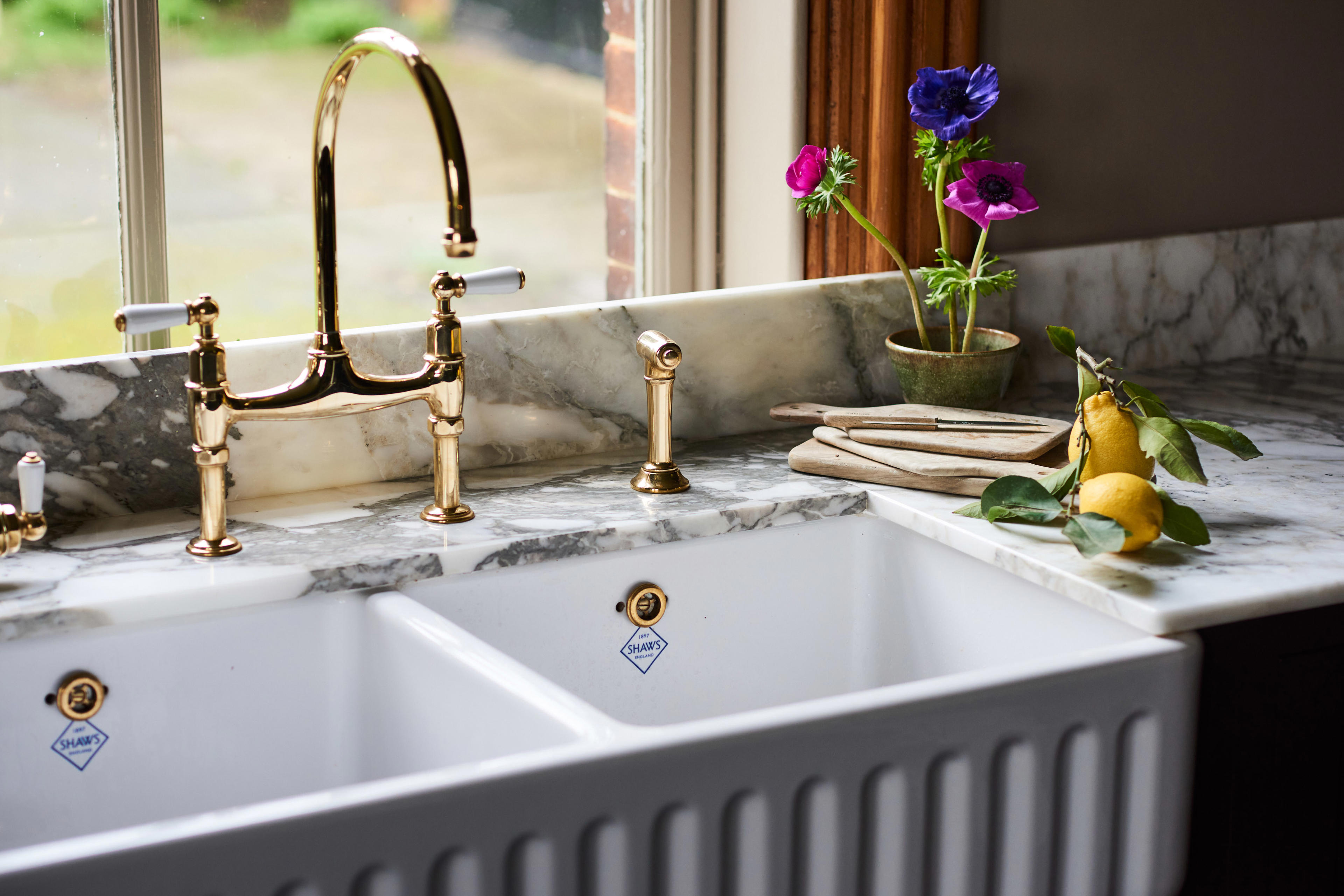 "For me, the key spot for the sink is under a window but the big beautiful sash window looking out on the front garden didn’t feel right and I knew a big round table would make the best use of that space. My lovely friend is an incredible food stylist and kitchen designer who works with celebrity chefs and I roped her in to help me. She took one look at the space and said it’s obvious the location of the sink is under the side window. It really is the dreamiest place to wash dishes in that gorgeous Shaws of Darwen Ribchester sink, looking out at the birds in the trees with the late afternoon sun streaming in. Who knew washing the dishes could be so wonderful? My double sink makes it so much less of a chore, I love the two sinks as I use one as a dish drainer instead of having a draining board."