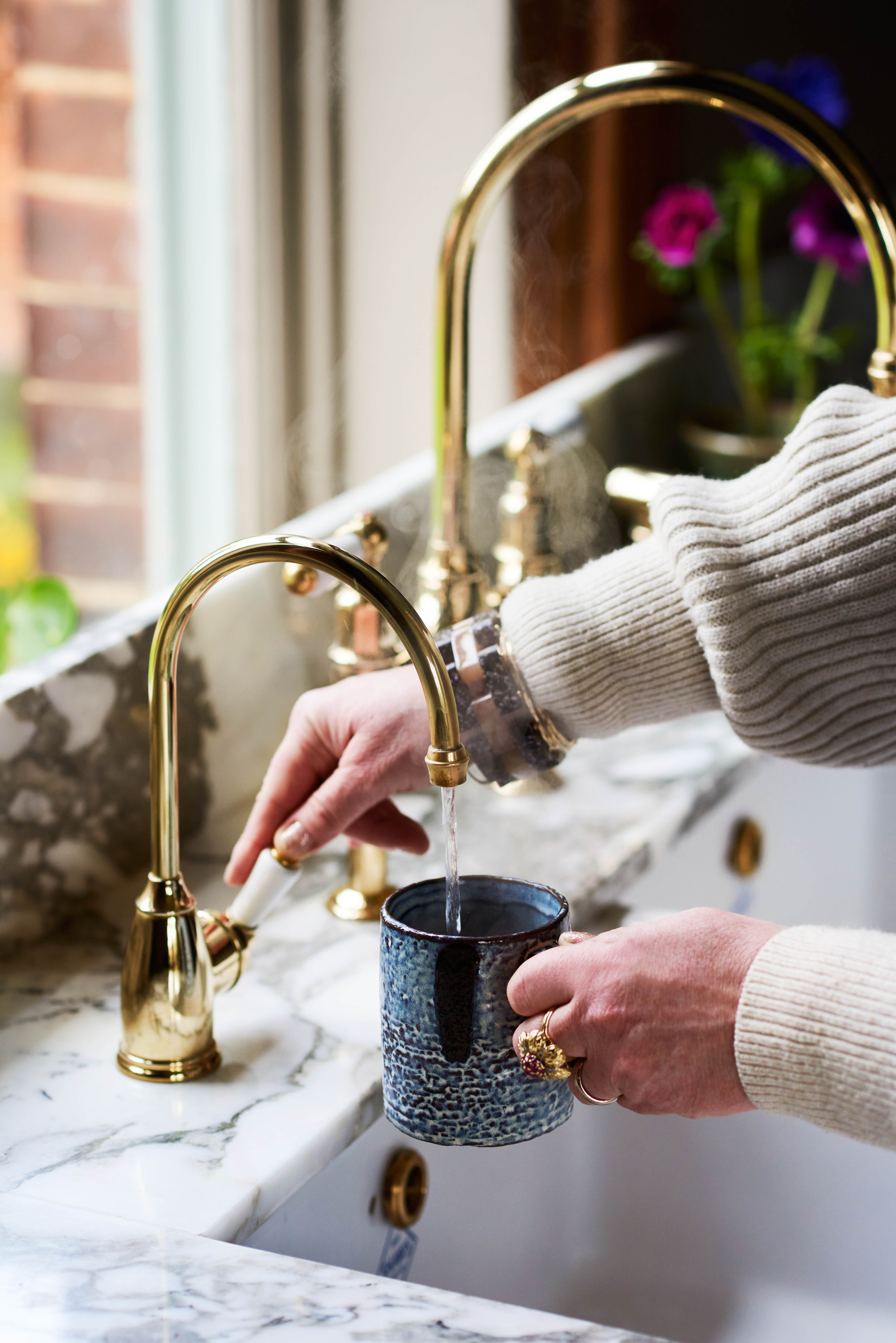 "The Perrin & Rowe instant hot water tap makes making a cup of tea so much easier, no longer do I hang around waiting for the kettle to boil! The pan filling tap above the stove is not only aesthetically pleasing but also makes cooking easier and takes the pain out of carrying pans of water across the kitchen to your stove. The beautiful brassware is easy to clean and the look elevates my entire stove area. We polish it every week and it's such a joy to see it shine."