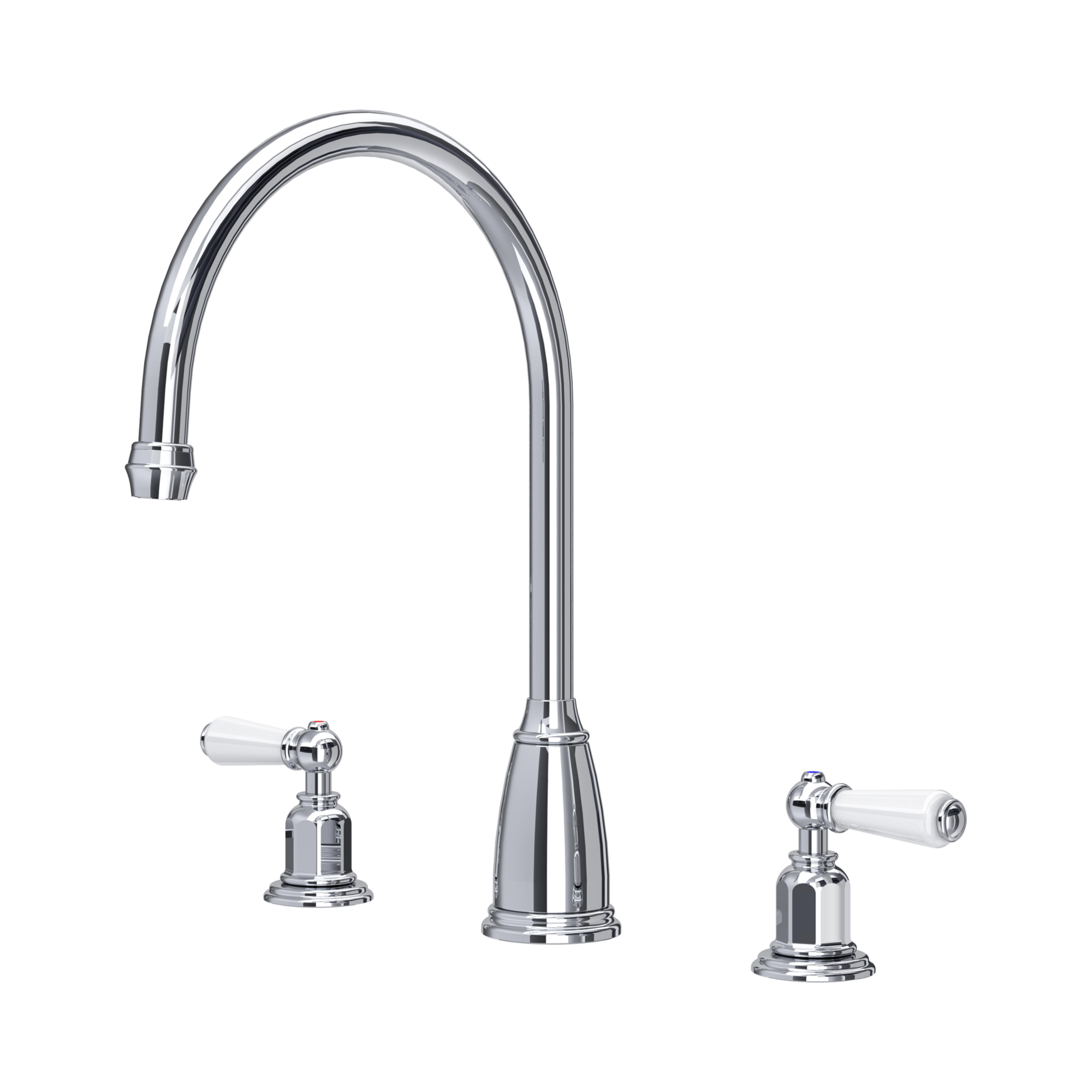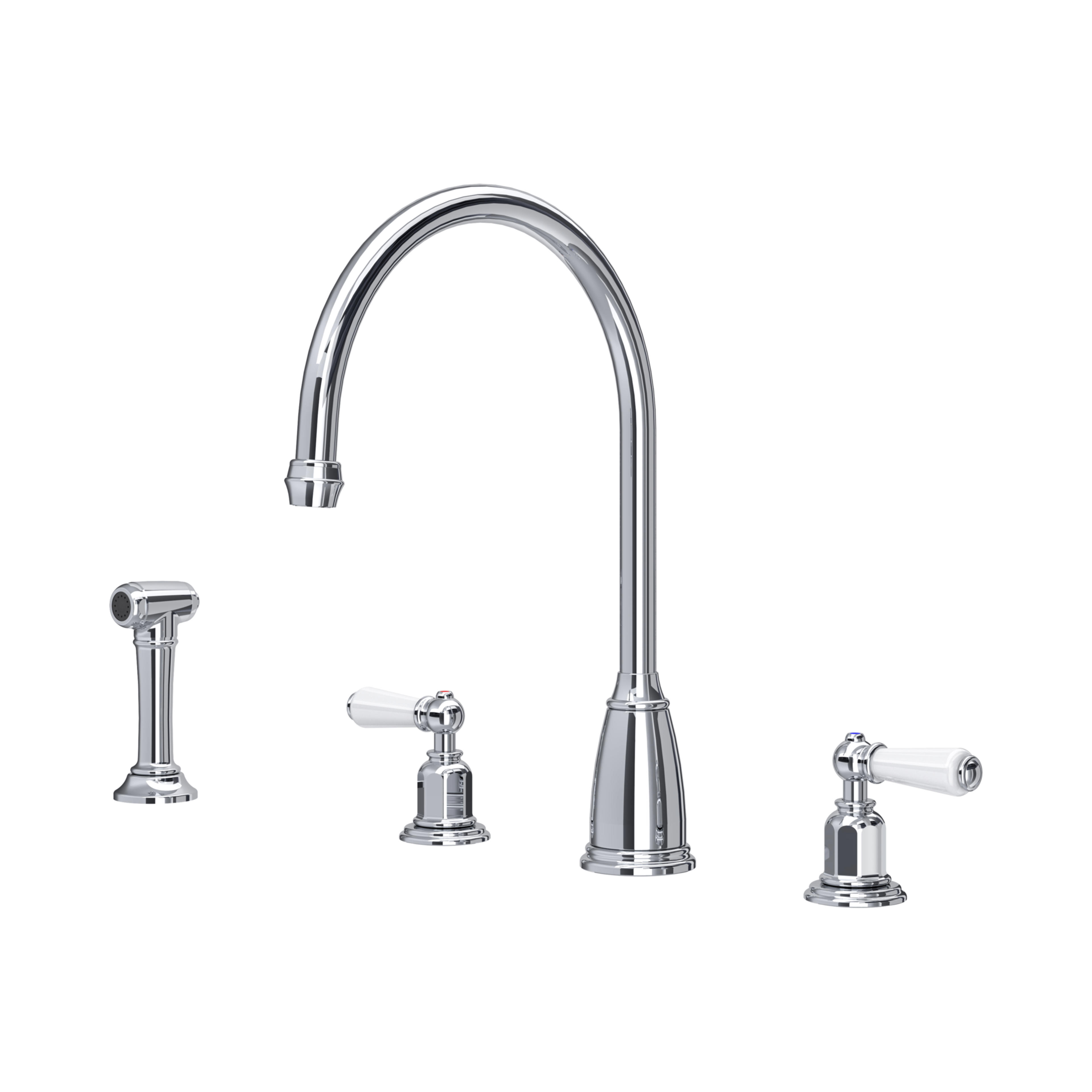 This version of the Langbourn widespread kitchen sink mixer features a beautiful curved C-shaped spout, lever handles for dispensing hot and cold water, plus a handy side spray rinse for help when cooking, cleaning and filling pots and pans.
